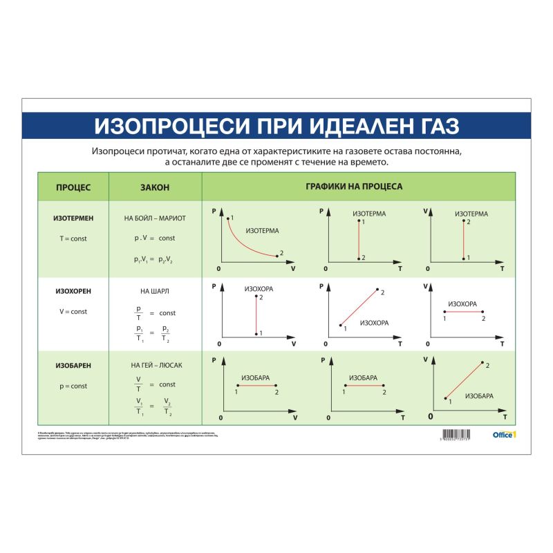 Office 1 Ученическо табло ''Изопроцеси при идеален газ'', 100 x 70 cm