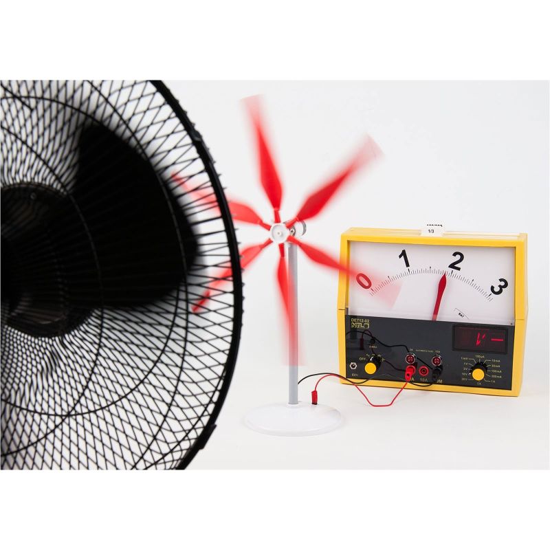 Голям работещ модел на вятърна турбина, който демонстрира преобразуването на вятърна енергия в електрическа енергия.