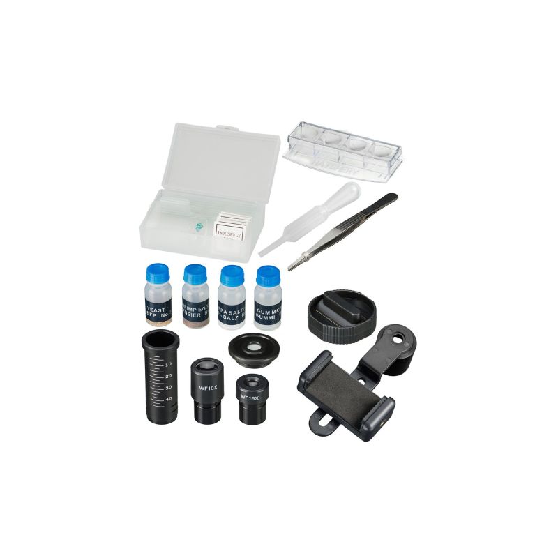 Ученическият микроскоп BRESSER JUNIOR с богата гама от аксесоари е достатъчен за начални стъпки в експериментите. С помощта на изваждаща се допълнителна леща, увеличението може да се регулира безстепенно до 2 пъти по време на визуално наблюдение, така че да се постигне увеличение от 40x до 1600x заедно с 3 обектива и 2 сменяеми широкоъгълни окуляра.