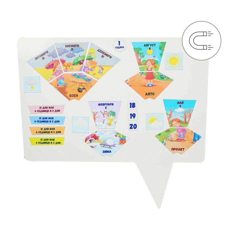 Образователният магнитен комплект "Календарна година" съдържа 76 пълноцветни магнитни елемента, изграждащи пъзел, показващ структурата на календарната година.