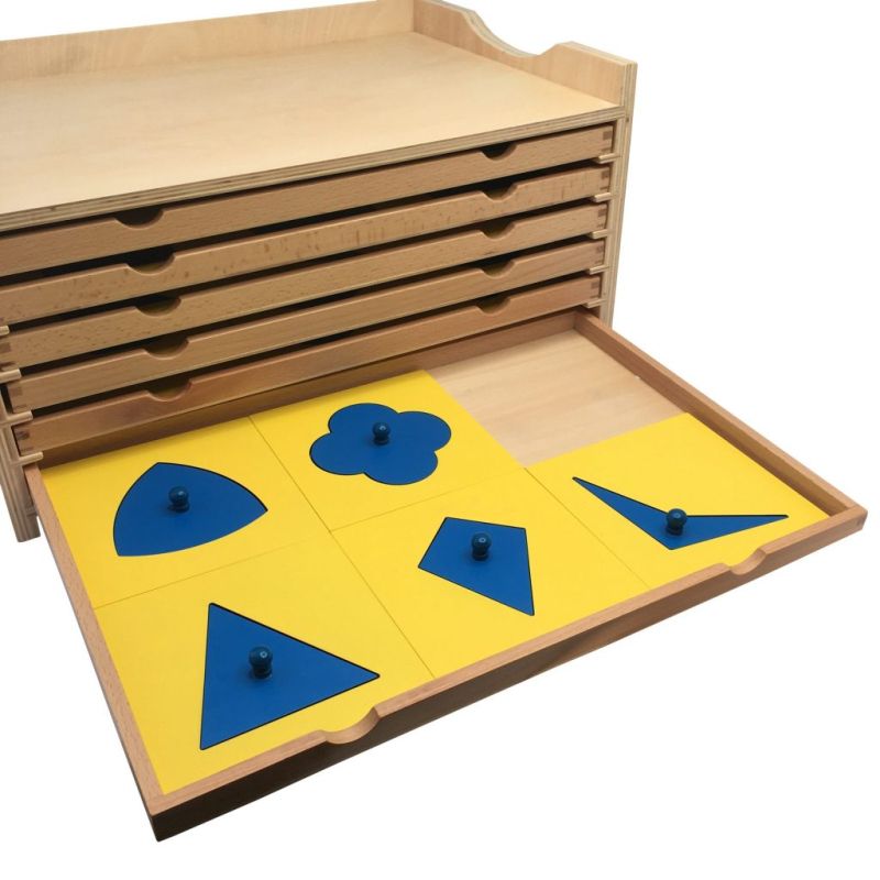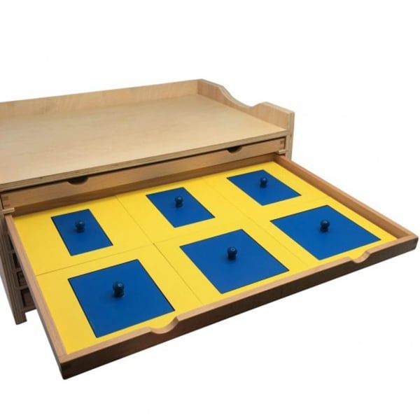 Продуктът представлява дървен скрин/шкаф с размери 50 х 31 х 25 cm. В скрина има 6 чекмеджета с отвор в средата, който позволява лесно и удобно изваждане на всяко от тях. След като се извади, всяко чекмедже може да служи като поднос, за да може децата лесно да занесат желаните материали до мястото си за игра. Във всяко чекмедже има по шест жълти квадрата, като във всеки квадрат има изрязан отвор с различна геометрична форма, в който се слага съответната геометрична форма.