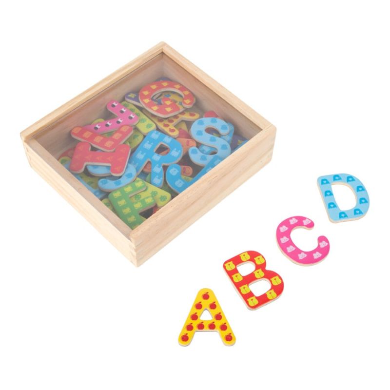 Комплектът се състои от 37 букви, изработени от цветно дърво с магнитно покритие.