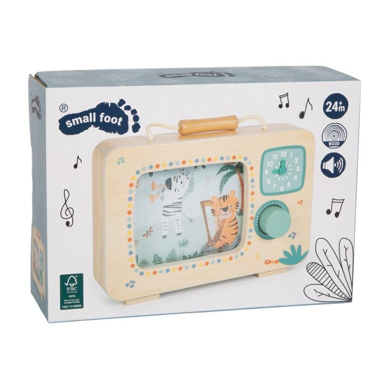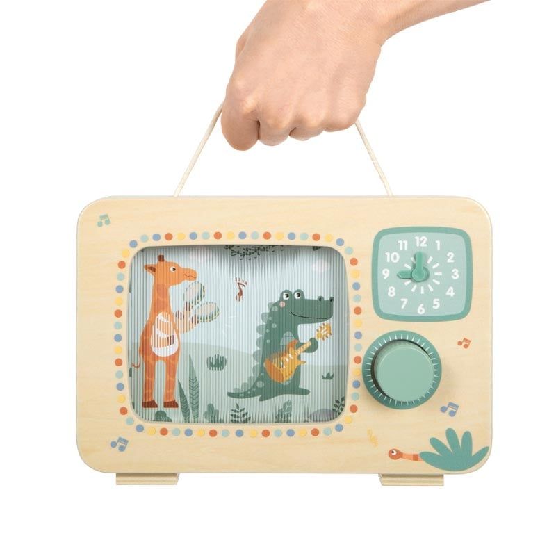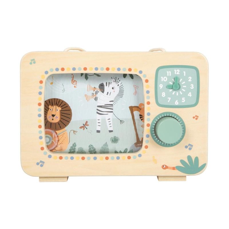 Преносима носталгия за малки ръчички: завърти страничното копче, за да оживее сцената от сафари и да зазвучи мелодията. Дръжката за носене и отпечатаният часовник с подвижни стрелки насърчават взаимодействие и ролеви игри навсякъде.