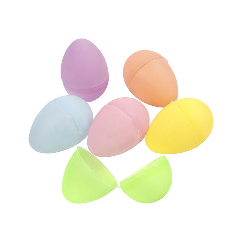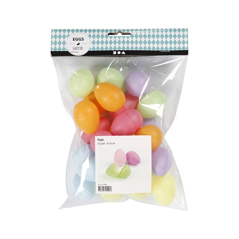 Комплект от пластмасови яйца в нежни пастелни цветове, за декорация. Всяко яйце е от две части.Опаковка с 6 цвята, всеки по 4 броя.