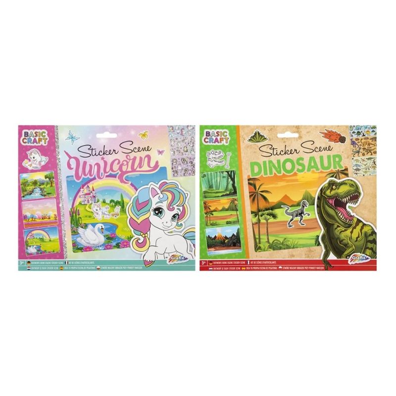 -24 комплекта забавни стикери с динозаври и 3 включени пейзажа; br> -24 комплекта забавни стикери с еднорози и 3 включени пейзажа. Продуктът е подходящ за деца над 3-годишна възраст.