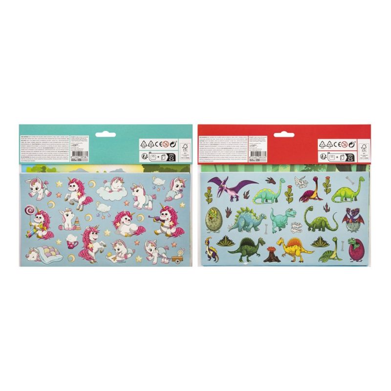 -24 комплекта забавни стикери с динозаври и 3 включени пейзажа; br> -24 комплекта забавни стикери с еднорози и 3 включени пейзажа.