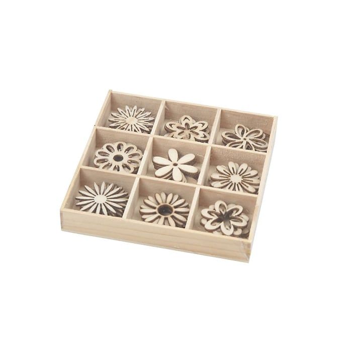Малки цветя за декорации от дървен фурнир.Опаковка от 9 дизайна всеки по 5 броя. Доставя се в кутия с 9 отделения. Размери: 28 mm.