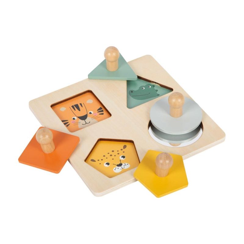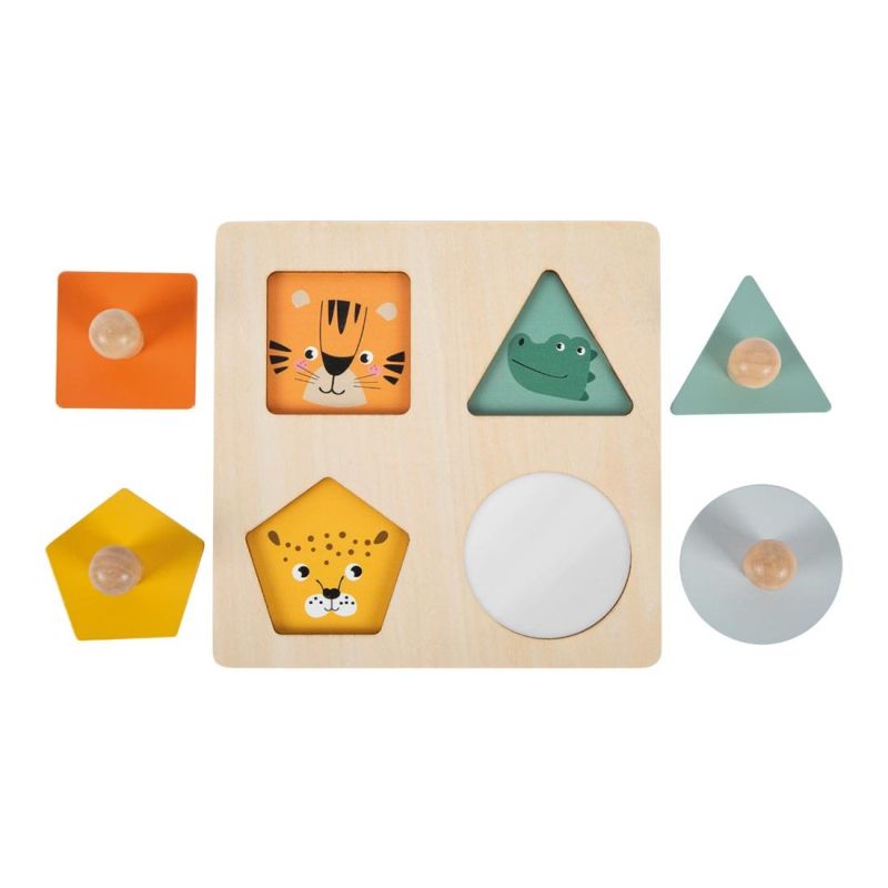 Здрав дървен пъзел с копчета, който съчетава съпоставяне на форми с приятни изненади: повдигни елементите, за да откриеш лица от джунглата и безопасно за деца огледалце. Перфектен за ранно любопитство и сръчност.