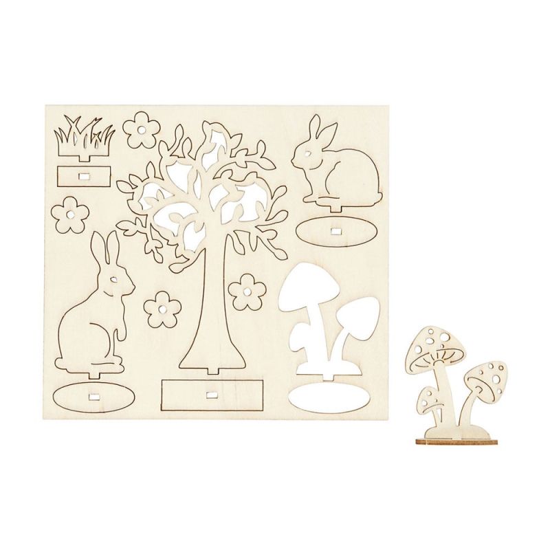 Дървен шаблон от фигури с фини детайли на дърво, цветя и зайци.