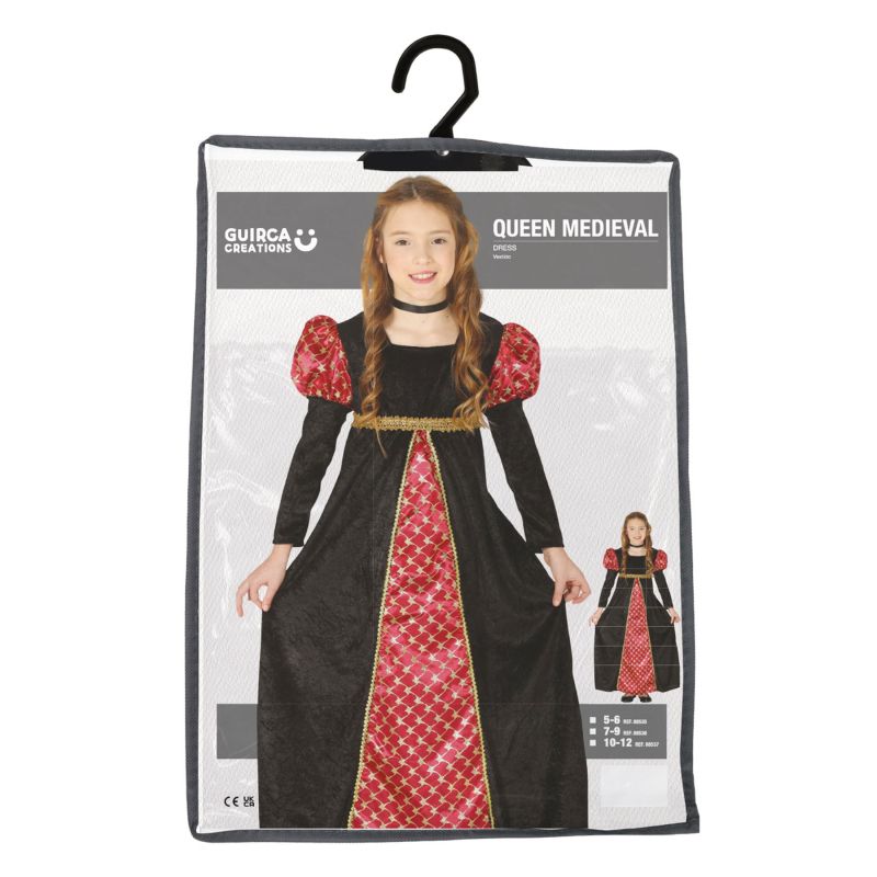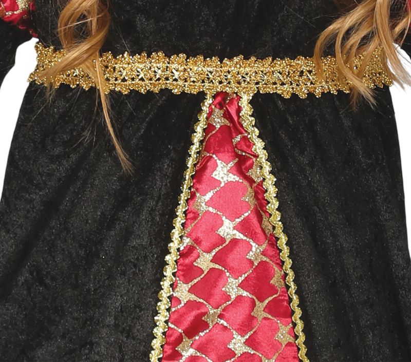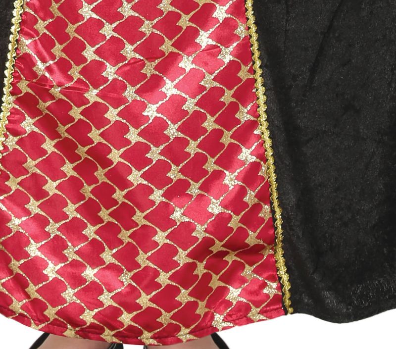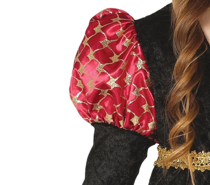 Комплектът включва дълга виненочервена средновековна рокля с буф ръкави и златисти декорации.