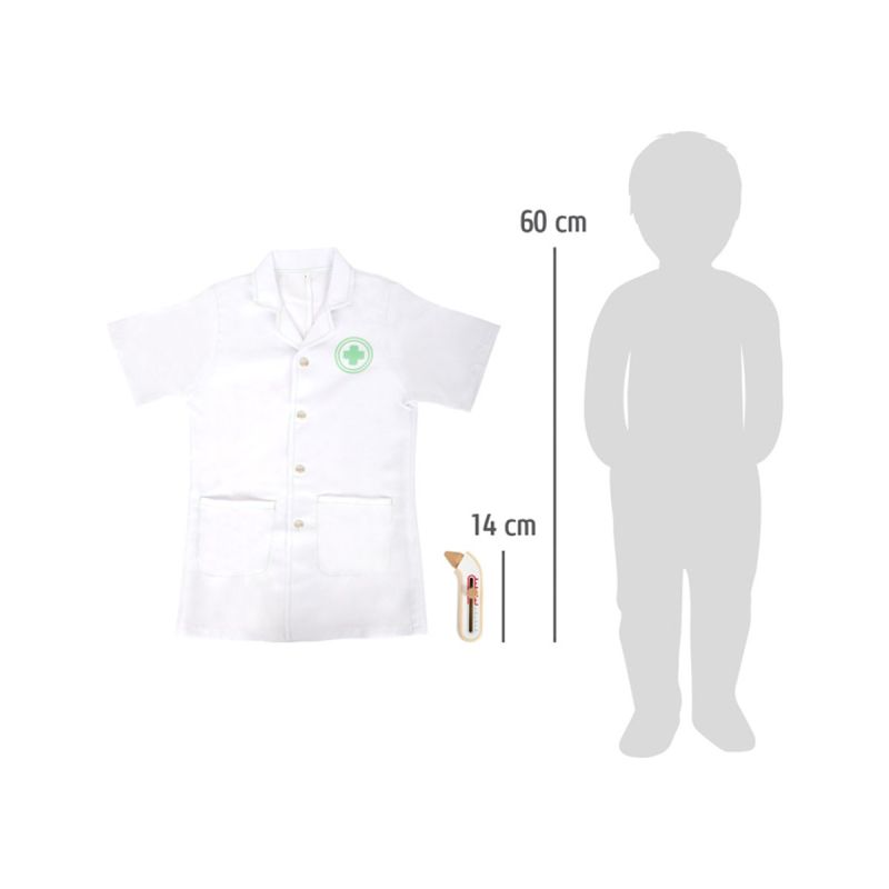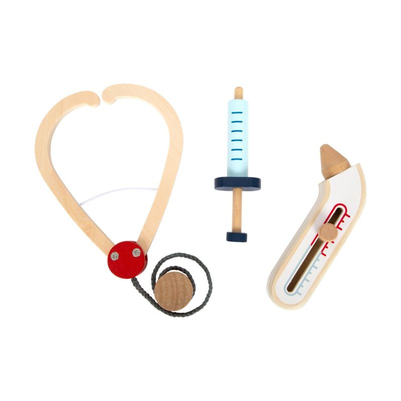 Включва лекарска престилка, спринцовка, стетоскоп и термометър, изработени от здрава дървесина за максимална автентичност и дълготрайност.