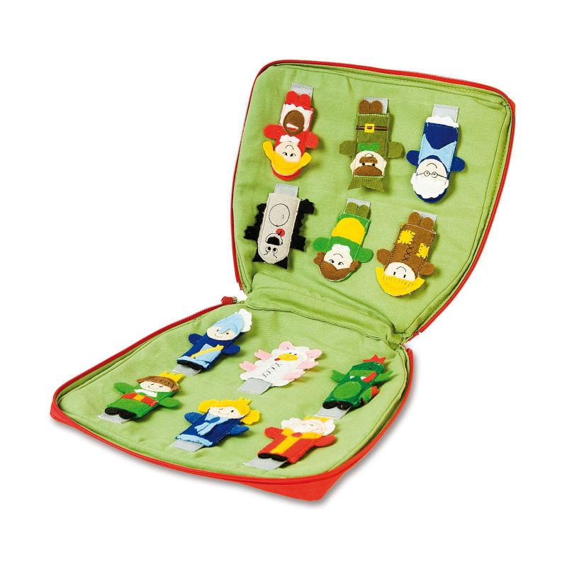 Комплект от 12 кукли за пръсти в удобна чанта под формата на къща. Къщичката и куклите са изработени от цветен филц. Детето ще може да управлява няколко кукли едновременно от приказките за Вавелския дракон и Червената шапчица. Играта насърчава ролевите игри.
