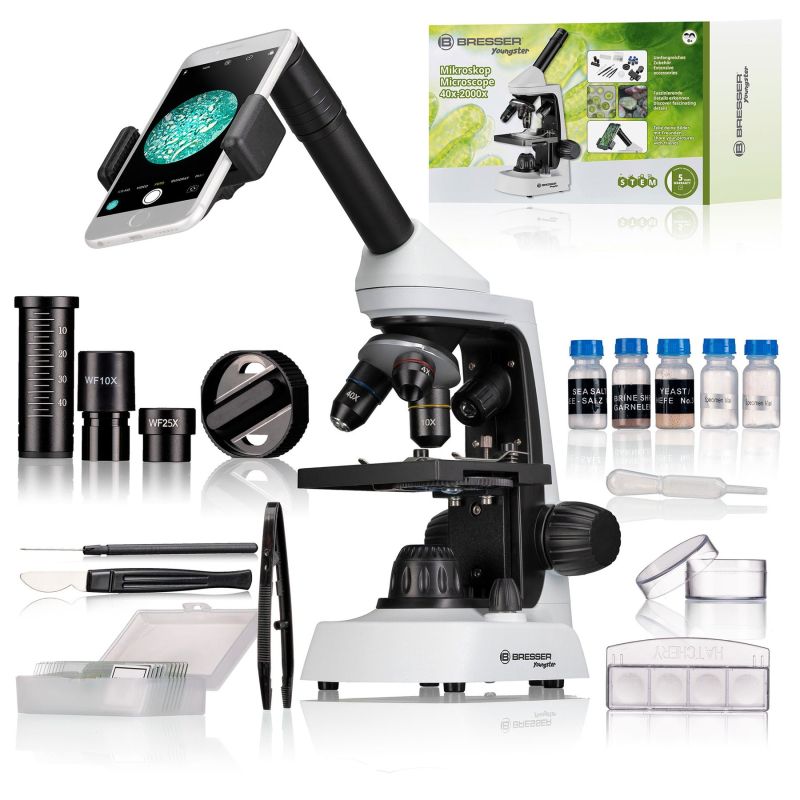 Комплектът включва окуляри и обективи за различни увеличения, регулируема поставка и допълнителни аксесоари за безопасност и стабилност.