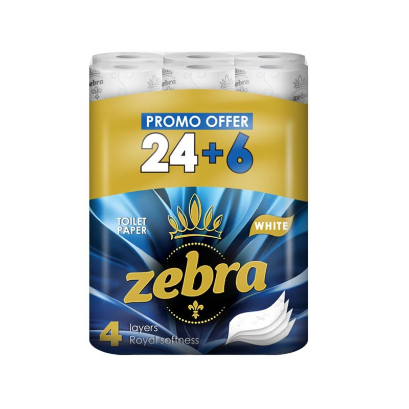 Тоалетна хартия Zebra White, четирипластова, 130 къса, 24+6 броя