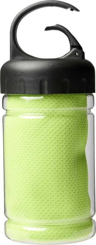Бързоабсорбираща и бързосъхнеща охлаждаща кърпа от полиестер. В пластмасов контейнер с дръжка за носене с вграден карабинер. 30 х 80 cm