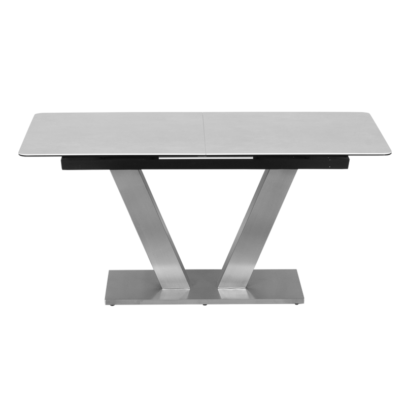 Разтегателната трапезна маса DUKLA впечатлява с модерен дизайн и висококачествена изработка. Плотът е от керамика и закалено стъкло, а основата от неръждаема стомана с изящен блясък, който създава усещане за лукс.