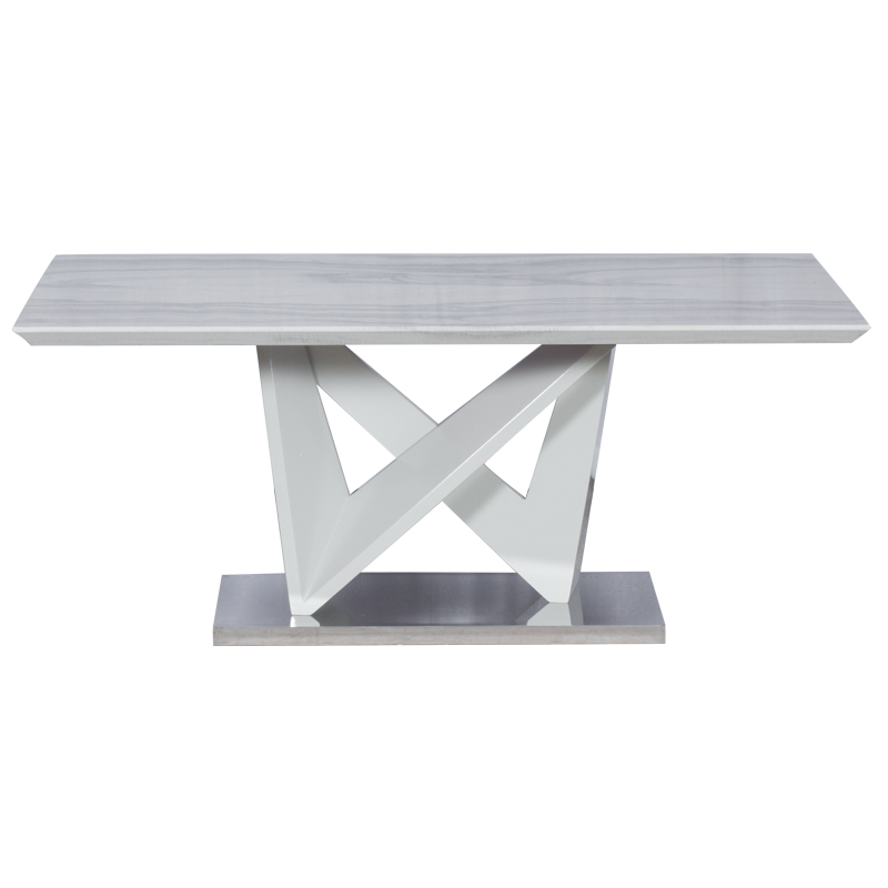 GEORGIA е масивна трапезна маса с оригинален и стилен дизайн. Моделът е с голям плот с размери 180 х 100 см., който е изработен от МДФ материал с покритие в мраморен цвят. Интересната основа с необичайна форма също е направена от МДФ, а в долната част от неръждаема стомана. Пълна информация за размерите и характеристиките на модела ще намерите в таблицата в таб/поле "Техническа информация".