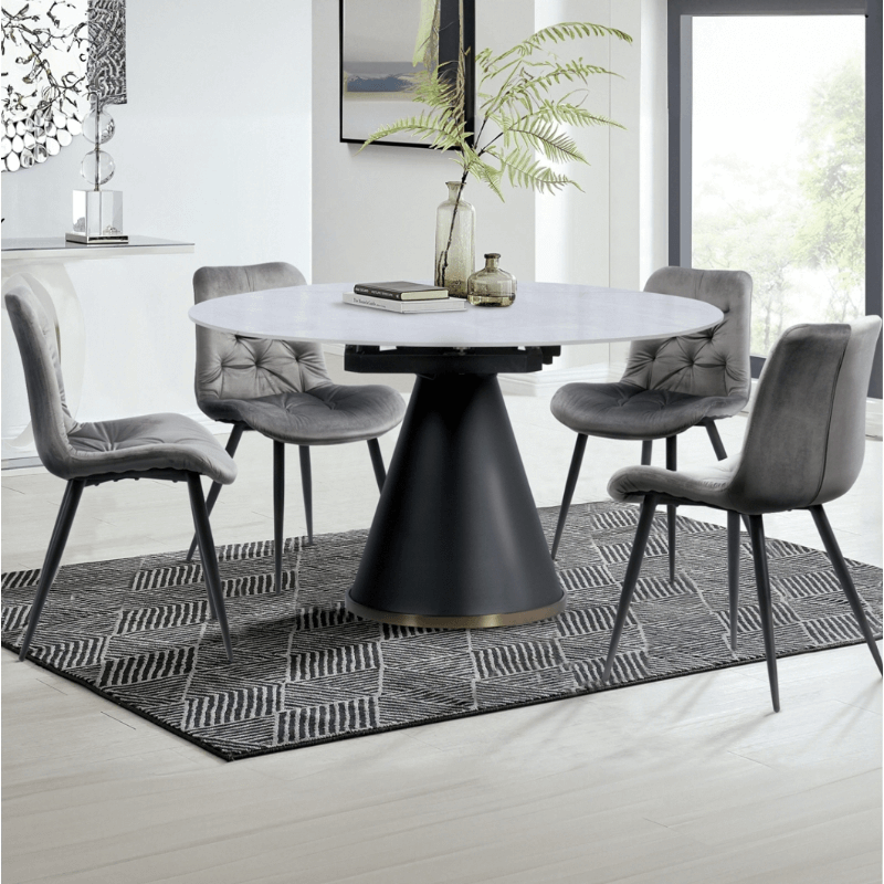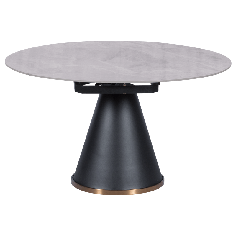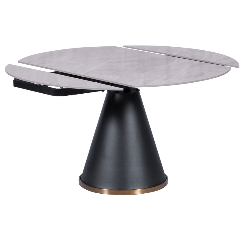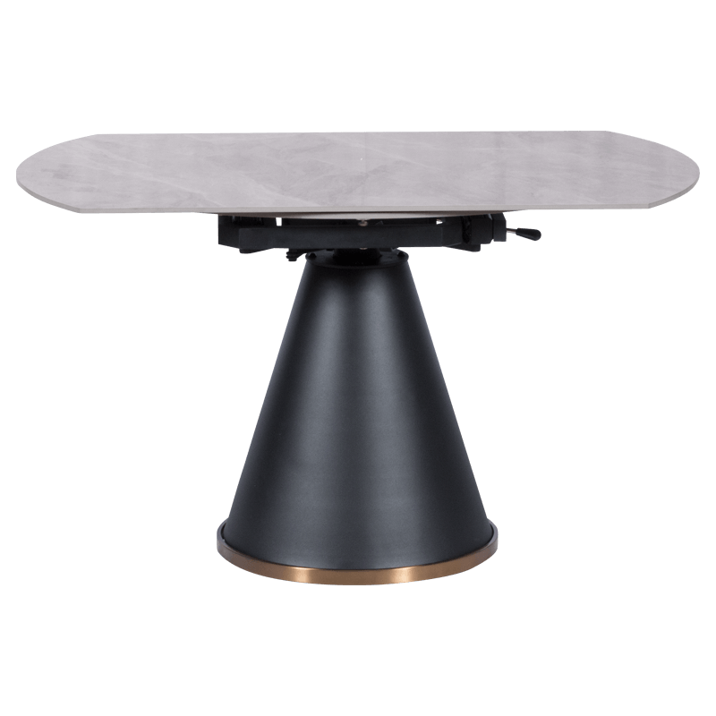 KRAG е модерна трапезна маса с масивна и нестандартна основа, изработени от праховобоядисан метал. Тя е с керамичен плот, с интересни шарки, а благодарение на въртящия се механизъм за разтягане ще ви осигури повече удобство, когато посрещате гости. Пълна информация за размерите и характеристиките на модела ще намерите в таблицата в таб/поле "Техническа информация".