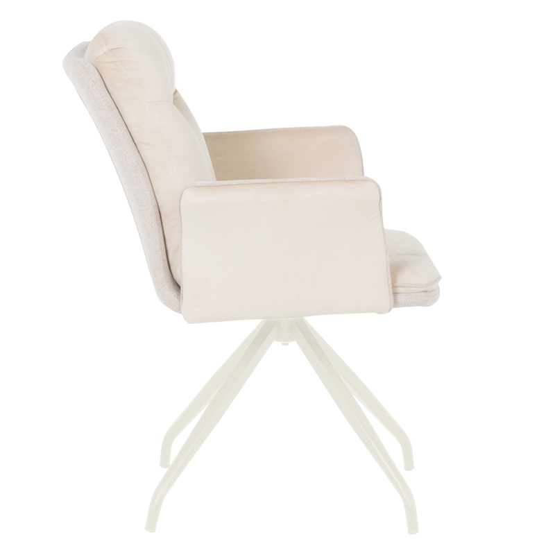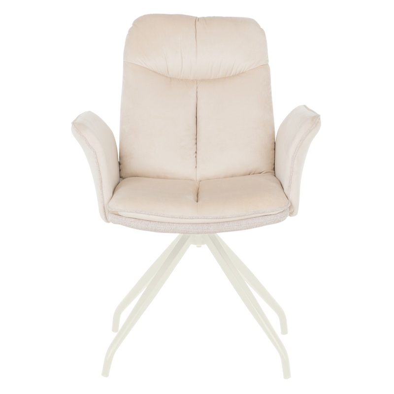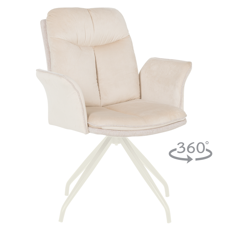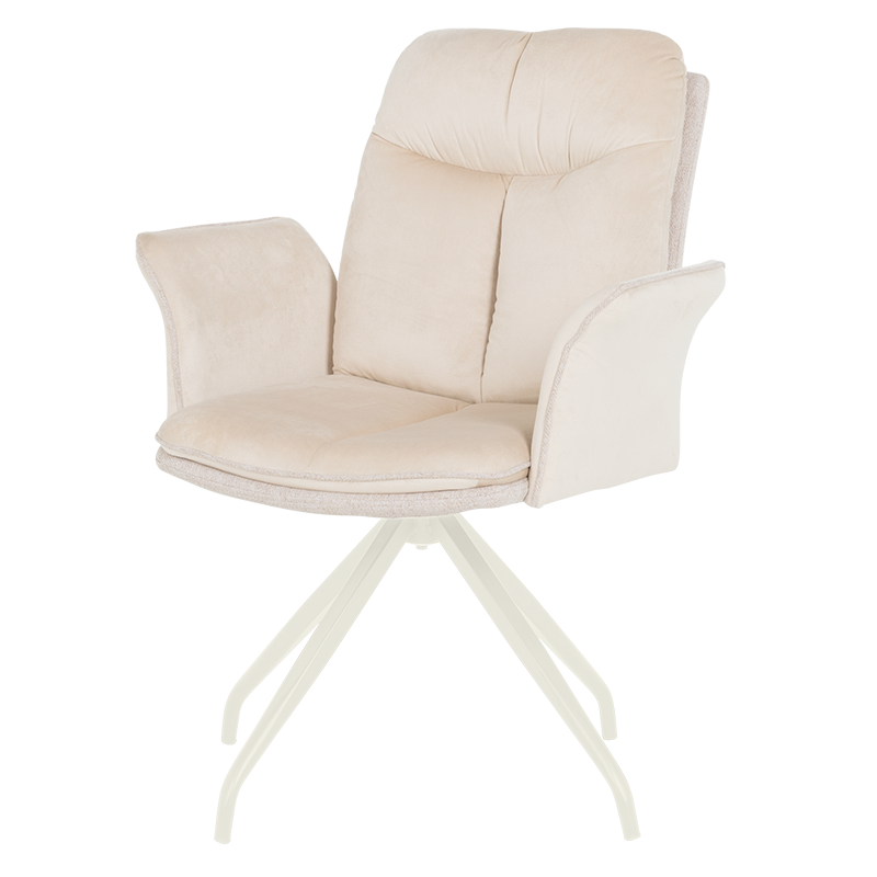 MARLOW 1 е трапезен стол с модерна визия. Той разполага с широки седалка и облегалка, тапицирани в мека дамаска, допълнени с възглавници за максимален комфорт. Подлакътниците повишават удобството на седящия. Основата е изработена от метал в елегантен кремав цвят и предлага иновативна функция за 360° въртене. Пълна информация за размерите и характеристиките на модела ще намерите в таблицата в таб/поле "Техническа информация".