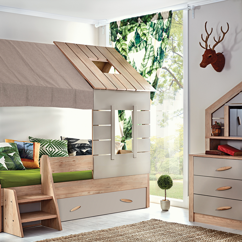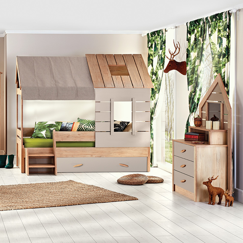 Детско легло от серия MY HOUSE е идеалното убежище за мечтите и приключенията на вашето мъниче. Със своя очарователен дизайн на горска къщичка с множество прозорци моделът разпалва въображението и е чудесно място за игра през деня. С просторната зона за спане детето ще се чувства комфортна през цялата нощ. Двете стъпала осигуряват лесен достъп на малчугана, насърчавайки независимостта му, докато се качва в леглото всяка вечер. Издръжливата ПДЧ конструкция гарантира дълготрайна употреба. Пълна информация за размерите и характеристиките на модела ще намерите в таблицата в таб/поле "Техническа информация".