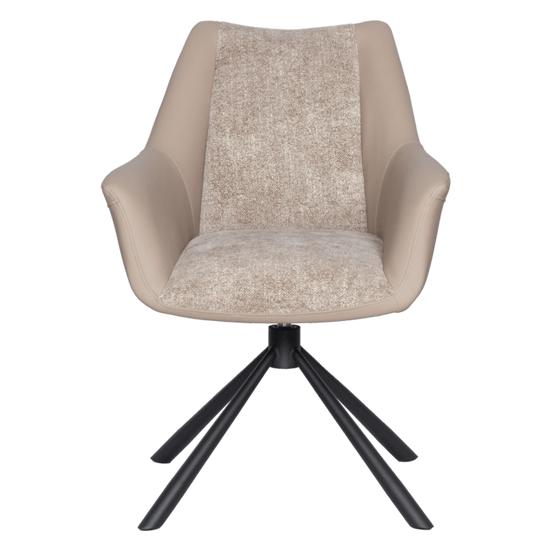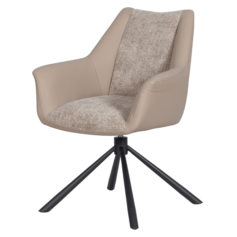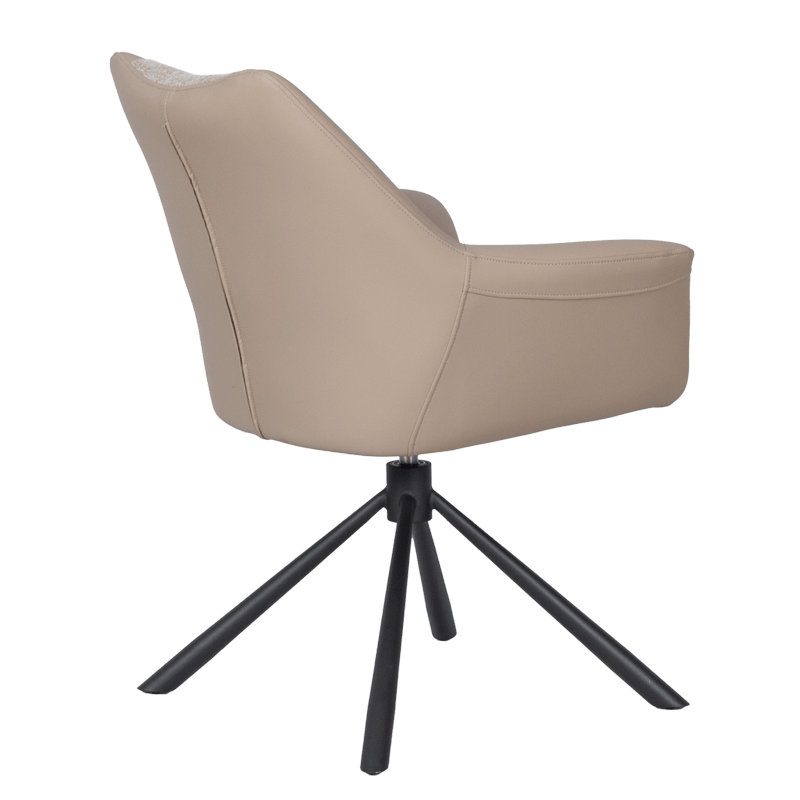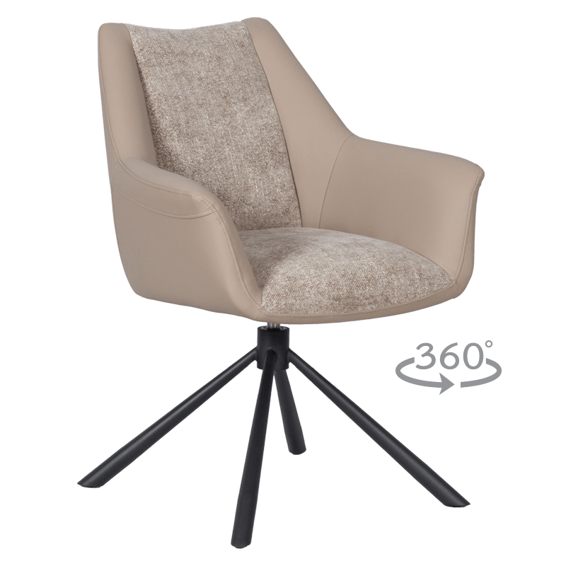 Трапезен стол TEMPE разполага с удобни подлакътници, широки седалка и облегалка, изработени от приятна на допир дамаска и висококачествена силиконова кожа. Интересната му основа е от метал, праховобоядисан в черно. Моделът има функция за въртене на седалката на 360° и връщането ѝ в изходяща позиция. Пълна информация за размерите и характеристиките на модела ще намерите в таблицата в таб/поле "Техническа информация".