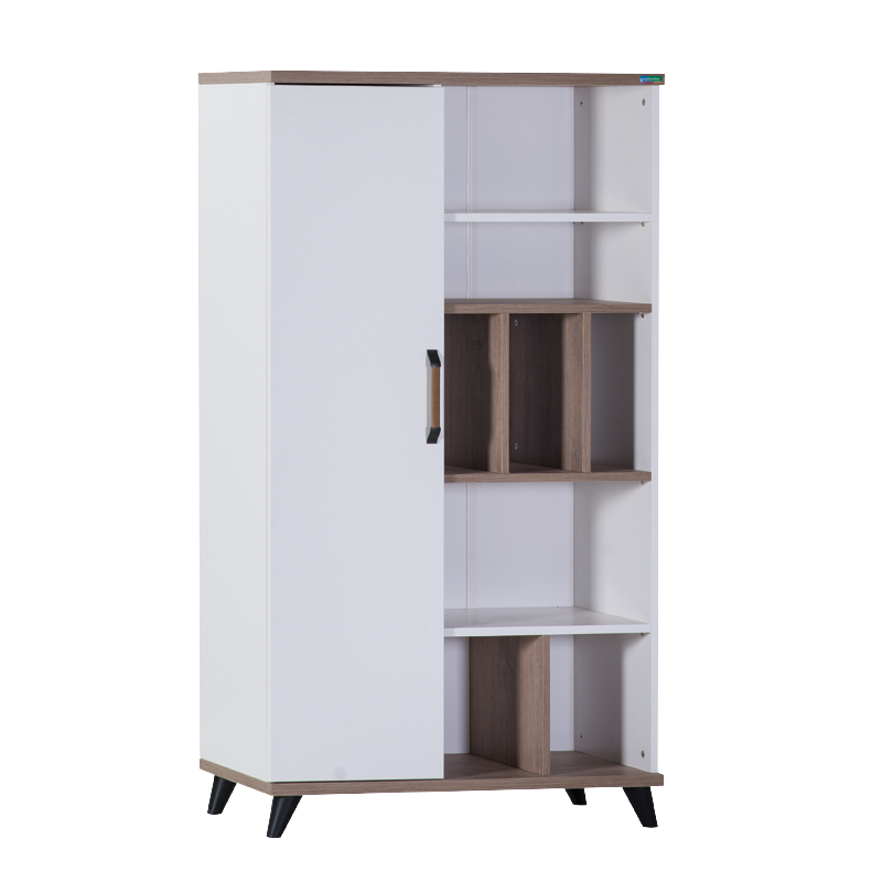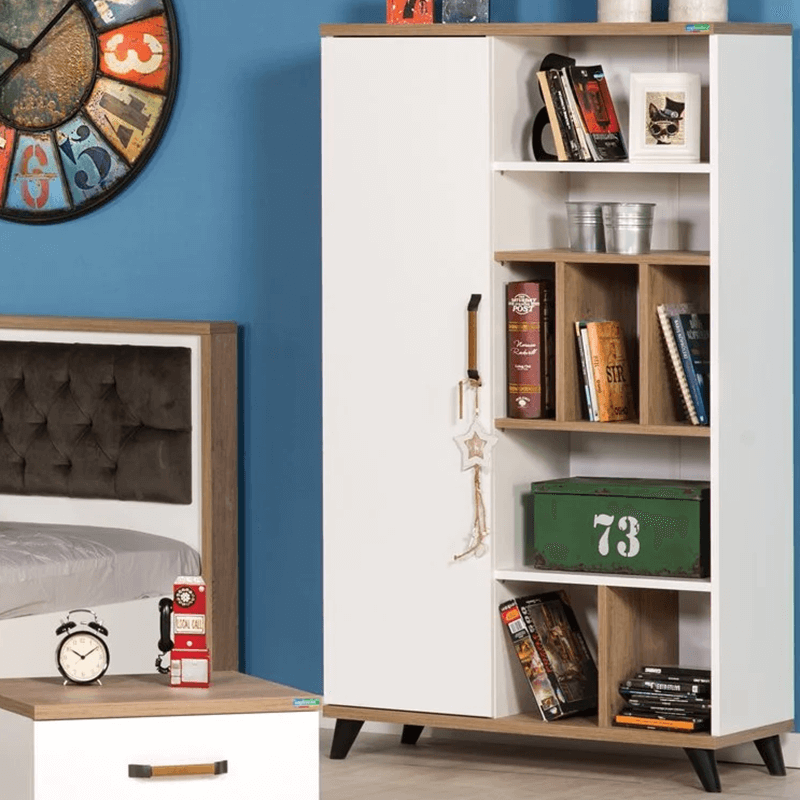 Етажерка за книги NATURA е практична и стилна мебел, която осигурява достатъчно място за съхранение не само на книги, но и на учебници и други лични вещи. Освен това има страхотна визия със своя просторен шкаф и 5-те октрити отделения. За максимално удобство вратичката на етажерката разполага и с механизъм за плавно затваряне.