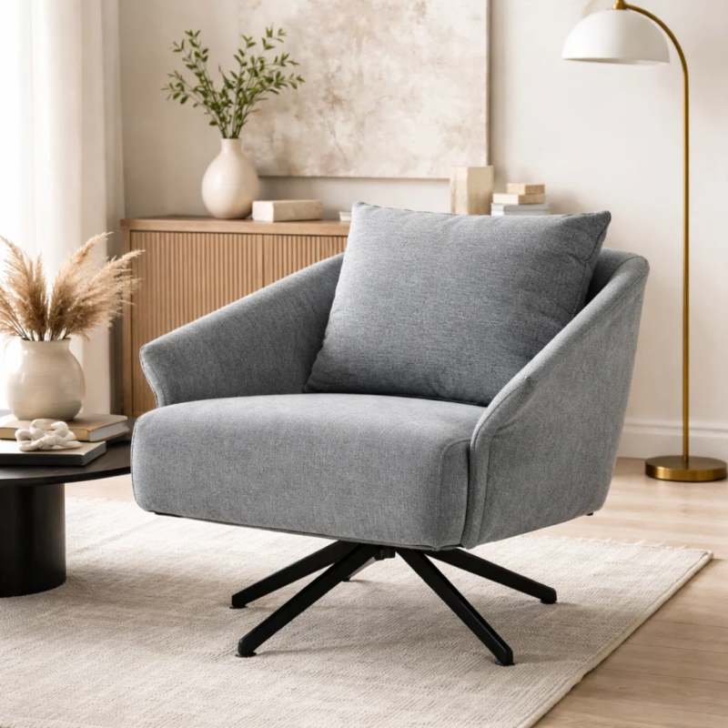 Кресло FERGUS е стилен и практичен избор за всеки модерен дом или изискан офис интериор. Седалката и облегалката са изработени от висококачествена дамаска, а краката от праховобоядисан метал. За по-голямо удобство моделът разполага с въртяща функция на 360°, както и с допълнителна възглавница.