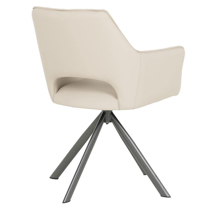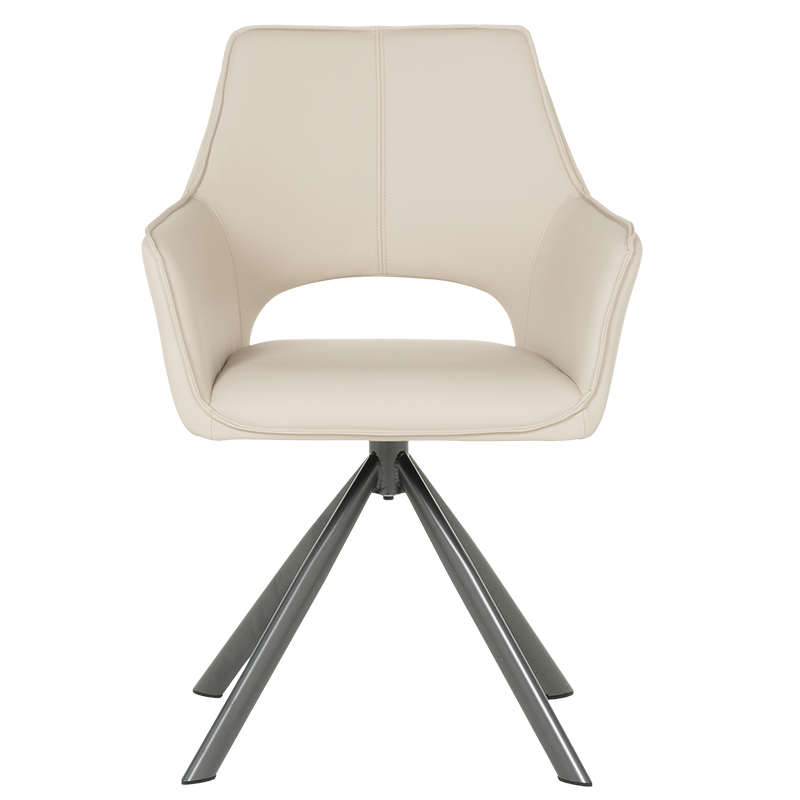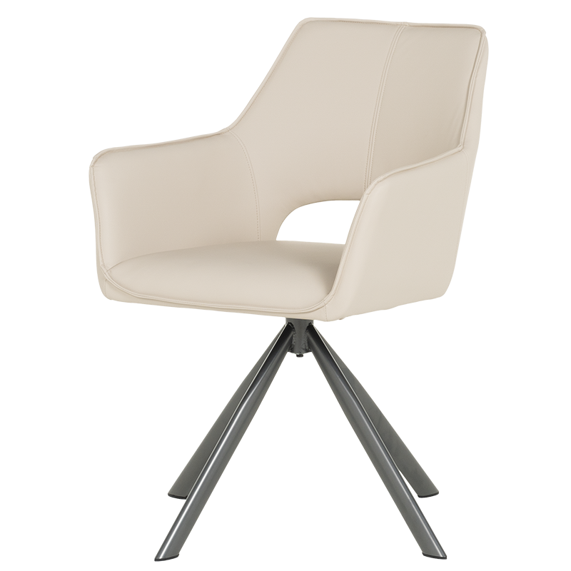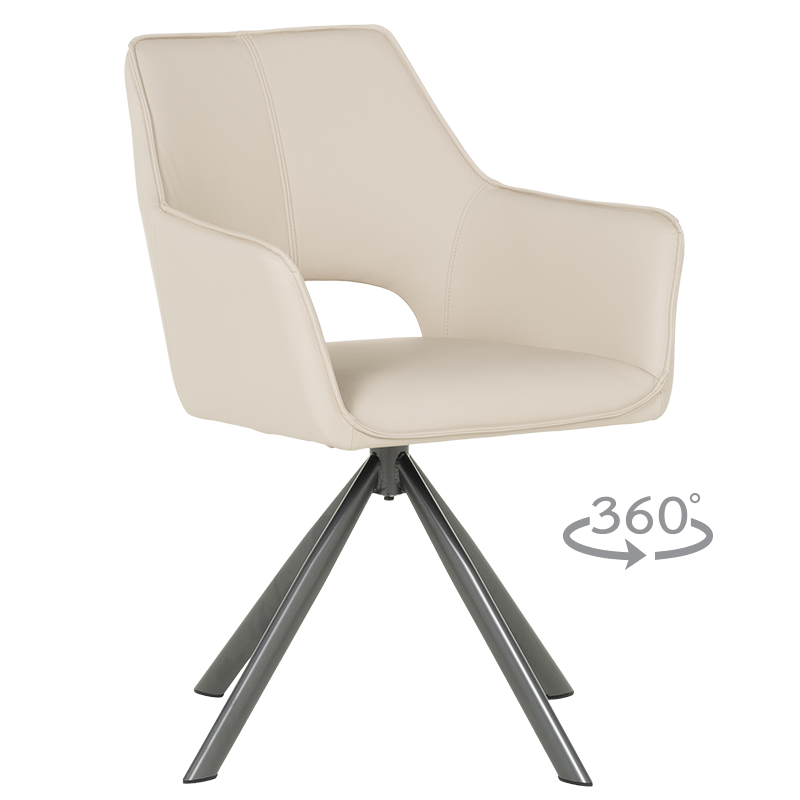 READING 2 е трапезен стол, който има широки облегалка и седалка, както и комфортни подлакътници от висококачествена силиконова кожа. Краката в интересна форма са изработени от праховобоядисан метал. Функцията за въртене на седалката на 360° носи допълнителен комфорт на седящия. Пълна информация за размерите и характеристиките на модела ще намерите в таблицата в таб/поле "Техническа информация".