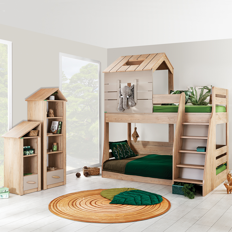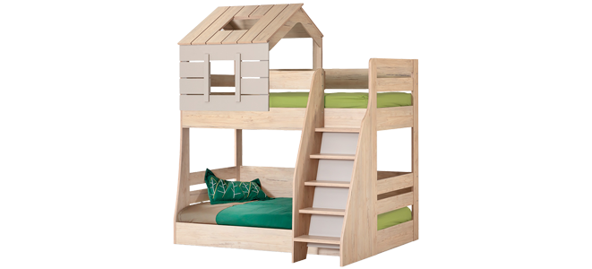 Двуетажно детско легло MY HOUSE е перфектно решение дори и за по-малки помещения. Страхотният дизайн на горска къщичка ще впечатли всеки малчуган. Моделът е изработен от висококачествени ПДЧ плоскости с включена подматрачна рамка. Горното легло е подходящо за матрак 90 х 200 см, а другото за матрак 100 х 200, като и двете предлагат практично решение за сън и почивка. Стълбичката, разположена от дясната страна, осигурява необходимата стабилност на децата при изкачване и слизане.