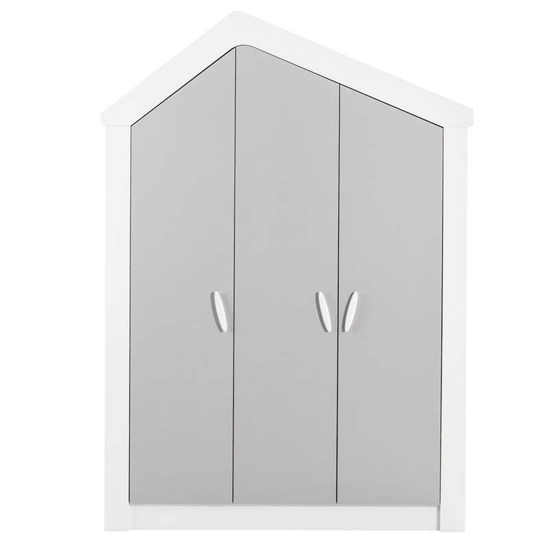 Трикрилен детски гардероб WHITE HOUSE има изчистен и стилен дизайн и се вписва чудесно във всеки интериор със своите сиви и бели цветове. Той разполага с голямо пространство, където да се съхраняват дрехи, играчки и други предмети. Благодарение на скосената част, наподобяваща покрив, създава забавна и приказна атмосфера в стаята на детето. Моделът е изработен от ПДЧ с дебелина 18 мм. Всеки един от неговите рафтове издържа на натоварване до 25 кг. Вратите на трикрикрилния гардероб се прибират плавно и безопасно с помощта на механизъм за плавно затваряне. Пълна информация за размерите и характеристиките на модела ще намерите в таблицата в таб/поле "Техническа информация".