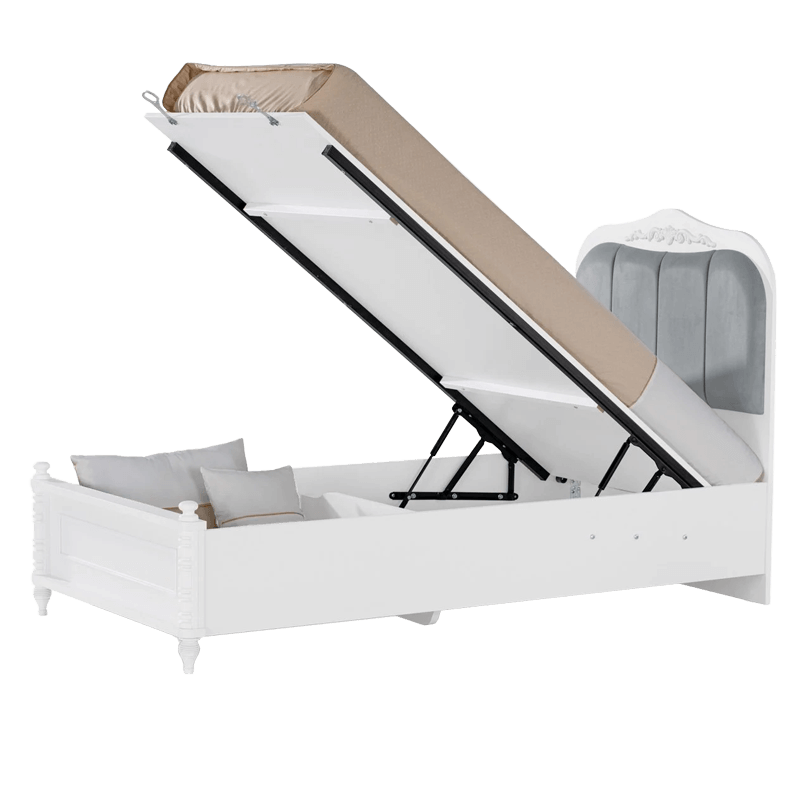 Детско легло с ракла NIL 120 x 200 е удобно и стилно допълнение към детската стая, изработено от 18мм ПДЧ и МДФ. Широката му ракла с предпазни ключалки на амортисьорите, може да събере всички детски играчки, книги и тайни. Пълна информация за размерите и характеристиките на модела ще намерите в таблицата в таб/поле "Техническа информация".