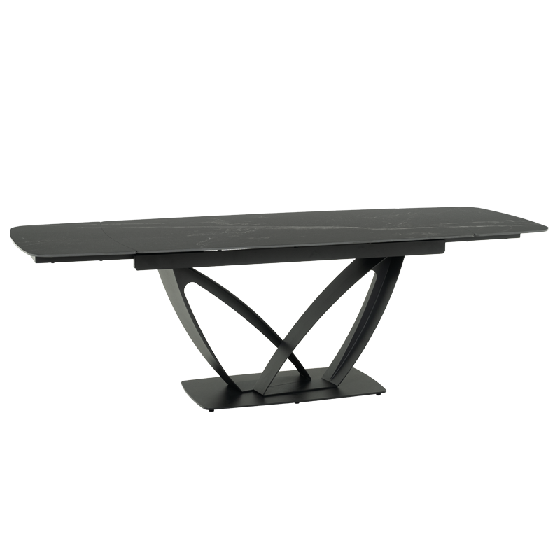 TORUN е трапезна маса с с интересна и нестандартна основа, изработена от праховобоядисан метал. Тя е с керамичен плот с шарки, наподобяващи мрамор. Благодарение на механизма за разтягане достига дължина до 240 см - така ще имате повече място, когато посрещате гости. Пълна информация за размерите и характеристиките на модела ще намерите в таблицата в таб/поле "Техническа информация".
