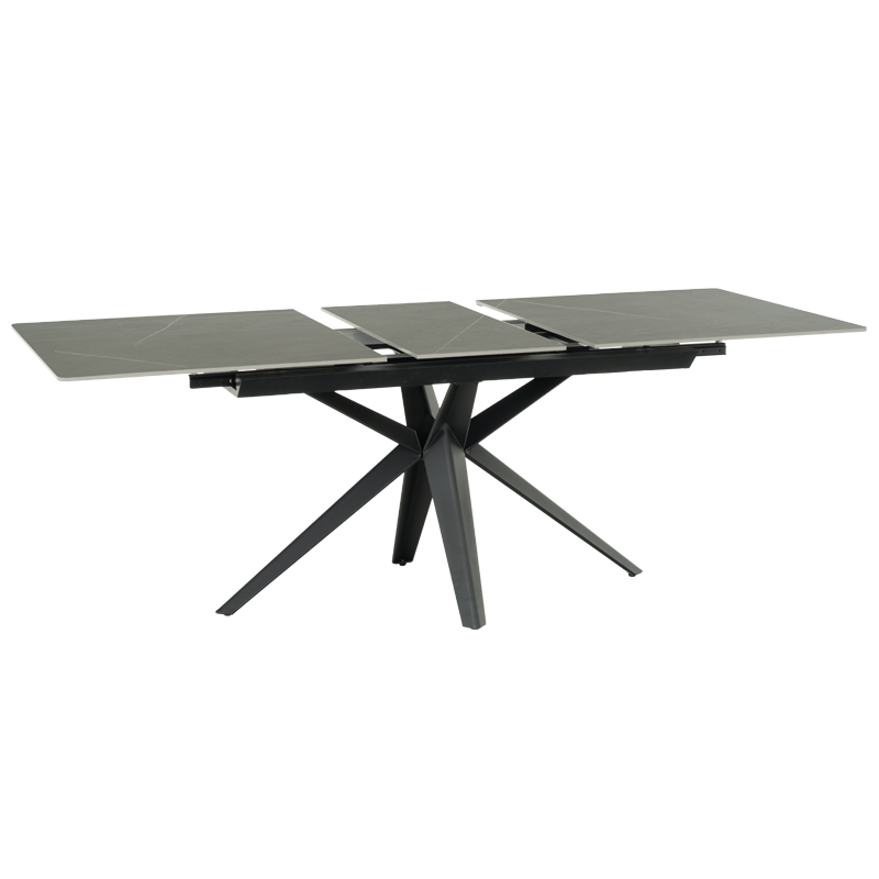 ZORY е трапезна маса с удобен разтегателен механизъм. Стилният ѝ дизайн я превръща в страхотен акцент за всеки дом. Керамичният плот е с дебелина 12 мм и със стандартен размер от 160 см, а при разтягане се удължава до 200 см. Така всеки гост или член на семейството ви ще се чувства комфортно. Разчупената метална основа осигурява стабилност и дълга експлоатация на масата. Пълна информация за размерите и характеристиките на модела ще намерите в таблицата в таб/поле "Техническа информация".