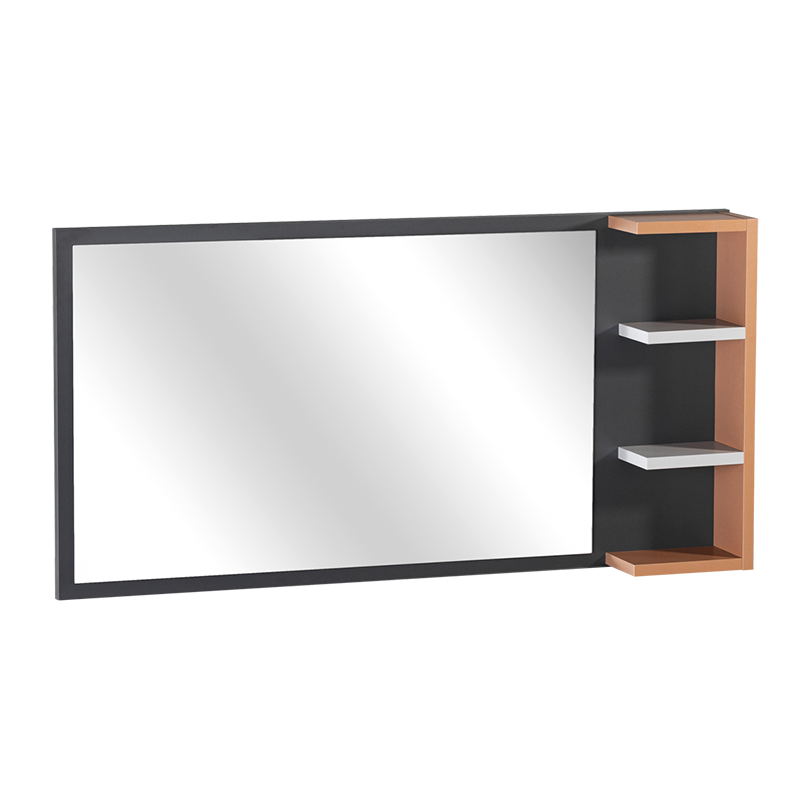 Огледалото BREDA за стена е перфектната комбинация от стил и функционалност, създадено за модерни и динамични интериори. Със своята елегантна правоъгълна форма и изчистена графитена рамка, това огледало добавя съвременно излъчване към всяка стая. Допълнено с три практични рафта от дясната страна, то осигурява допълнително място за съхранение на малки предмети, козметика или аксесоари, като същевременно допринася за по-добра организация. Рафтовете са в светли тонове, които създават визуален контраст с графитената рамка и придават елегантност и стил. Огледалото BREDA не е просто отражение, а акцент, който добавя дълбочина и характер на пространството ви. Пълна информация за размерите и характеристиките на модела ще намерите в таблицата в таб/поле "Техническа информация".