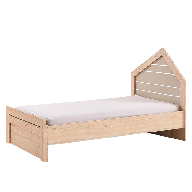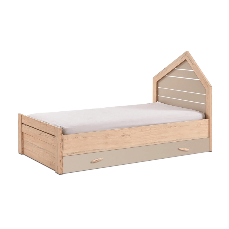 Детско легло MY HOUSE е истински уютен оазис за детската стая. Таблата му е оформена като покрив на къща, придавайки уникален и забавен вид, който ще зарадва всяко дете. Изработено от висококачествено ПДЧ с дебелина 18 мм, леглото носи топлината със своята дървесна разцветка, създавайки комфортна и приятна атмосфера. Подходящо за матрак 90х200 см и с капацитет до 130 кг, леглото е не само красиво, но и изключително практично, с опция за добавяне на чекмедже за съхранение.