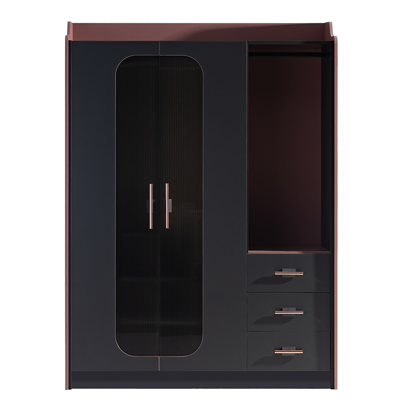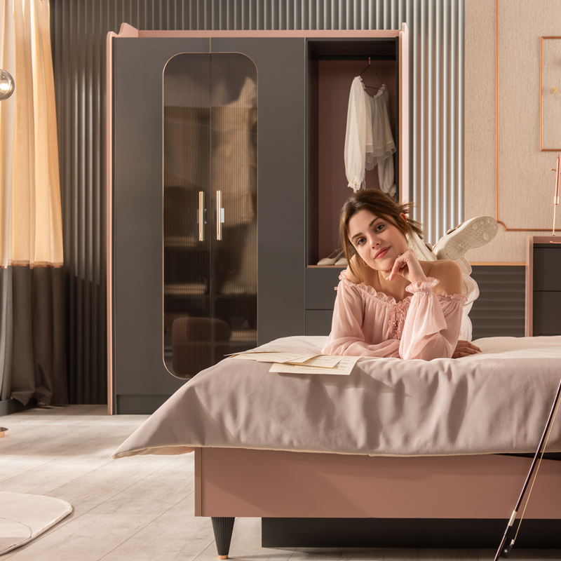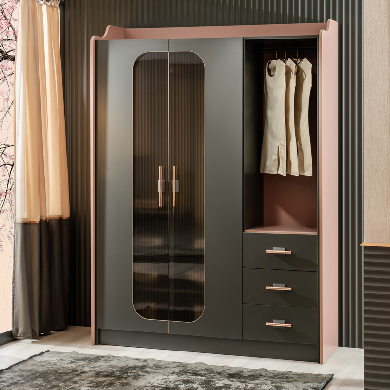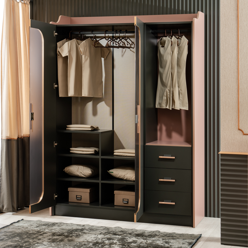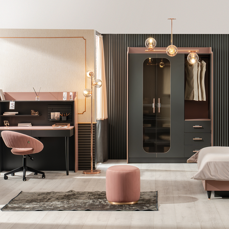 Гардеробът VALENCIA е създаден, за да внесе стил и елегантност в стаята на всяко момиче. Съчетанието на пастелно розово и тъмни цветове придава съвременен и впечатляващ вид. Златистите дръжки и изтънчените линии подчертават неговия изискан дизайн. Гардеробът предлага практично съхранение с чекмеджета, рафтове и отделение за закачалки, което осигурява идеален ред и функционалност. VALENCIA е перфектното съчетание на естетика и практичност, което ще направи всяко начало на деня по-приятно.