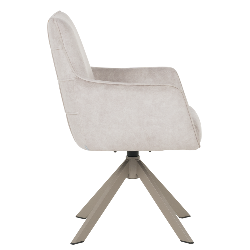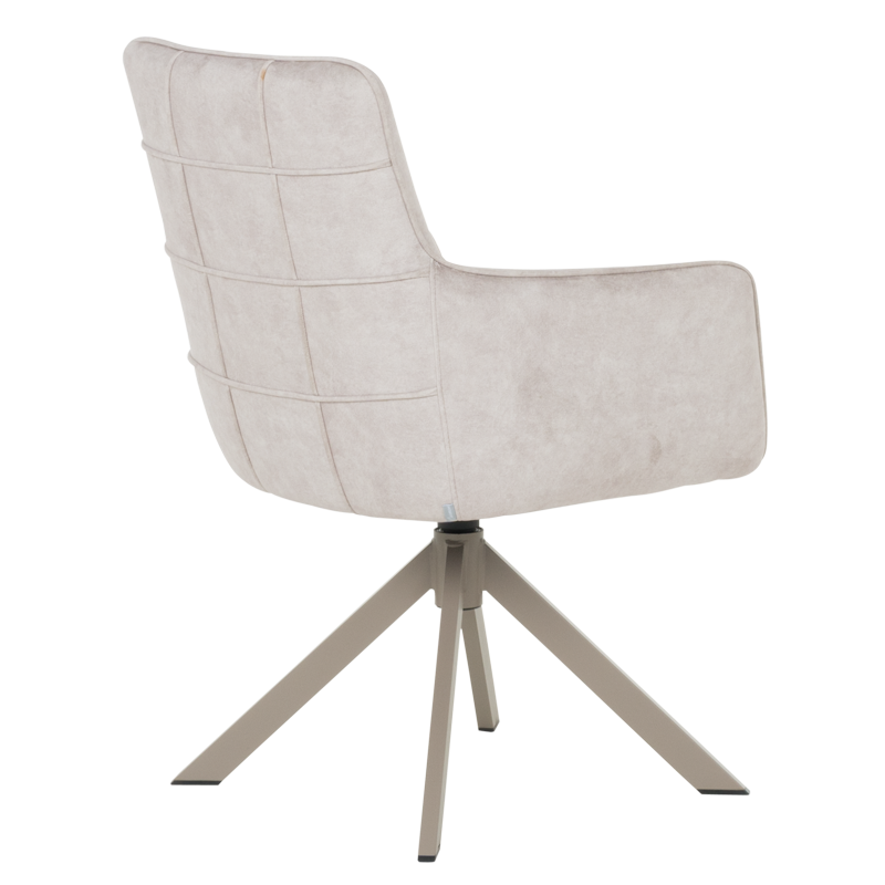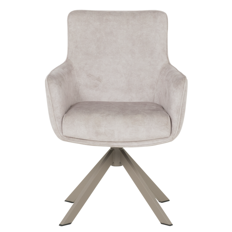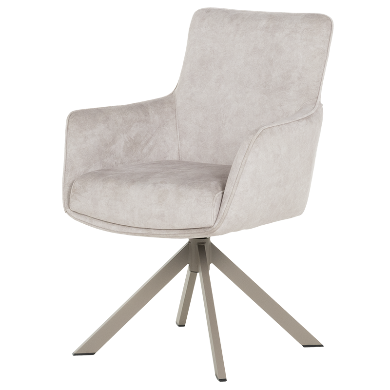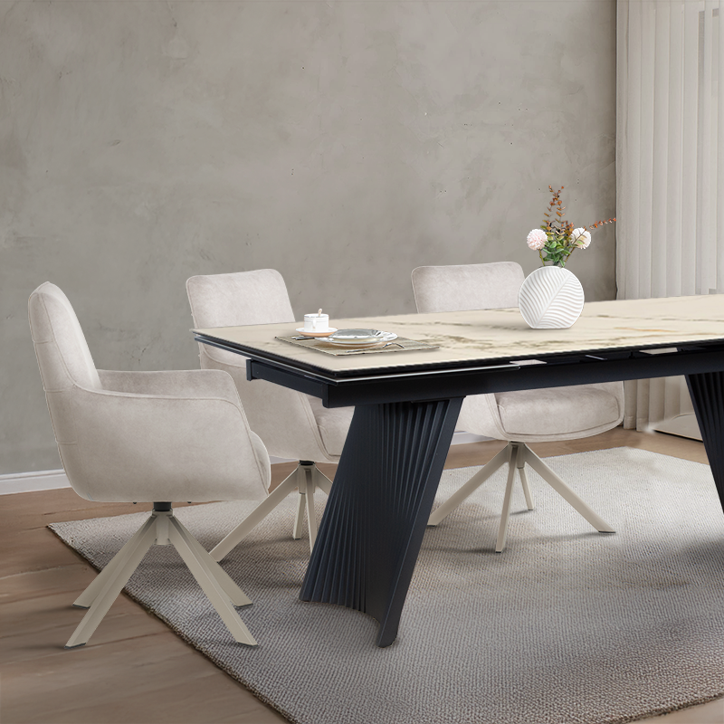 Трапезният стол VALGA впечатлява със своя съвременен дизайн и функционалност, създавайки идеалния баланс между стил и комфорт. Седалката е тапицирана с висококачествена дамаска и е оборудвана с покет пружини, които осигуряват удобство за продължителна употреба. Подлакътниците добавят допълнително усещане за уют, правейки стола подходящ както за хранене, така и за почивка. Уникалната функция за въртене на 360° с автоматично връщане в изходна позиция прави стола изключително практичен, а масивната основа от праховобоядисан метал с перлен блясък добавя нотка на елегантност. Люлеещият механизъм създава релаксиращо изживяване, което прави стол VALGA идеален избор за модерната трапезария. Пълна информация за размерите и характеристиките на модела ще намерите в таблицата в таб/поле "Техническа информация".