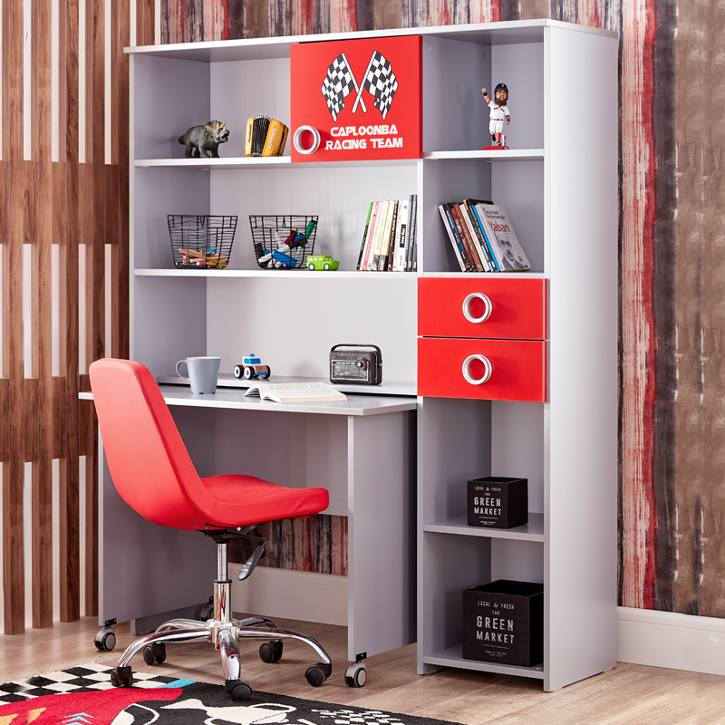 Бюрото TURBO CAP 2 е перфектен помощник за децата както за учене, така и за игри! Със свежи червени и сиви тонове, то добавя стил и забавление към всяка детска стая. Благодарение на просторните рафтове и отделения, учебните материали, играчките и книгите могат лесно да се подредят. Освен това, бюрото е снабдено с колелца, което го прави лесно за преместване и пренареждане в стаята. С комбинацията от затворени и отворени пространства за съхранение, поддържането на ред никога не е било по-лесно! Пълна информация за размерите и характеристиките на модела ще намерите в таблицата в таб/поле "Техническа информация".
