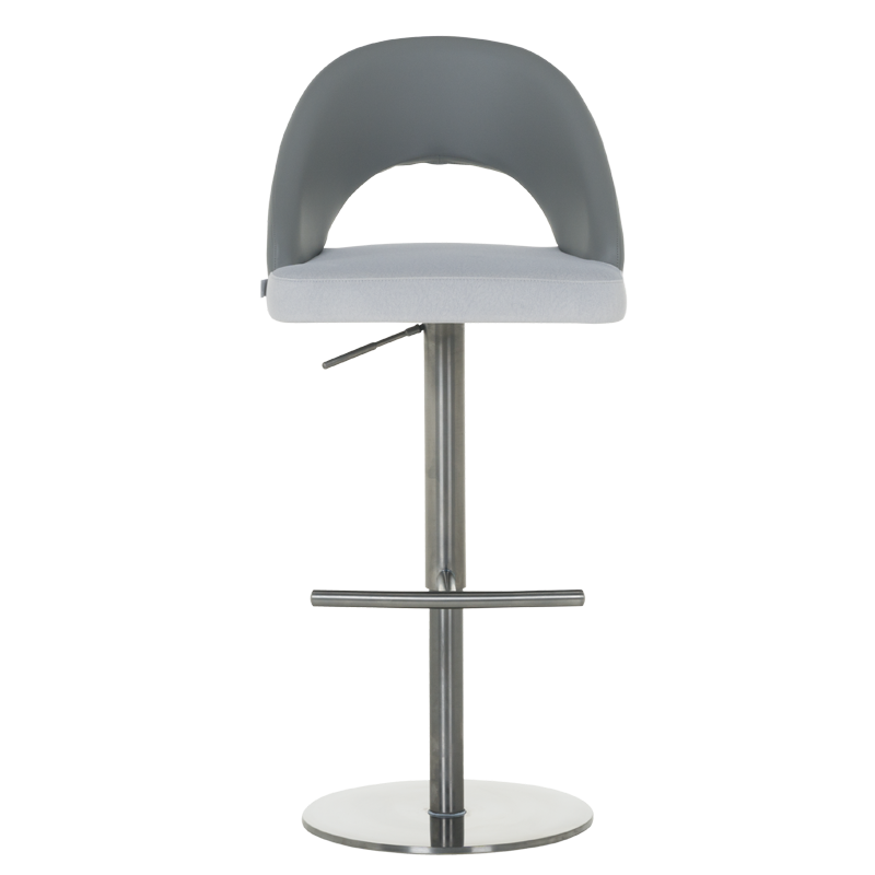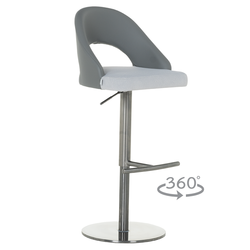 Бар стол KUTANA съчетава елегантност и минималистичен дизайн, перфектно допълващ съвременните интериорни решения. Седалката е тапицирана в светлосива еко кожа, придаваща мекота и комфорт, докато стилната основа от полирана неръждаема стомана осигурява стабилност и дълготрайност. Столът предлага възможност за 360-градусово въртене, което добавя удобство при ползване, а функцията за регулиране на височината с газов амортисьор позволява персонализиране на нивото на седене. Моделът е проектиран да издържа натоварване до 120 килограма, като съчетава комфорт и надеждност. Пълна информация за размерите и характеристиките на модела ще намерите в таблицата в таб/поле "Техническа информация".