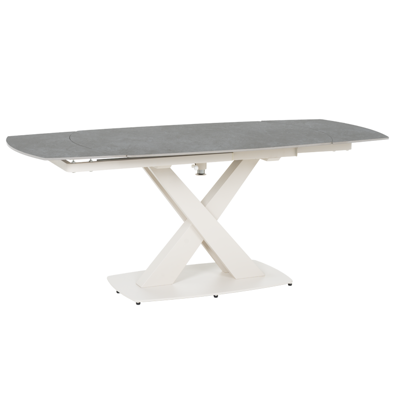 Разтегателна трапезна маса MATEO в изискан кремав цвят съчетава модерна визия с практичност. Плотът от керамика добавя издръжливост и изтънчен стил, докато основата от праховобоядисан метал впечатлява със своята здравина и елегантност. Благодарение на разтегателния механизъм, масата лесно се трансформира от 130 см до 190 см, осигурявайки достатъчно пространство за вашите специални моменти. MATEO е не просто мебел, а акцент, който ще придаде свежест и класа на вашата трапезария. Пълна информация за размерите и характеристиките на модела ще намерите в таблицата в таб/поле "Техническа информация".