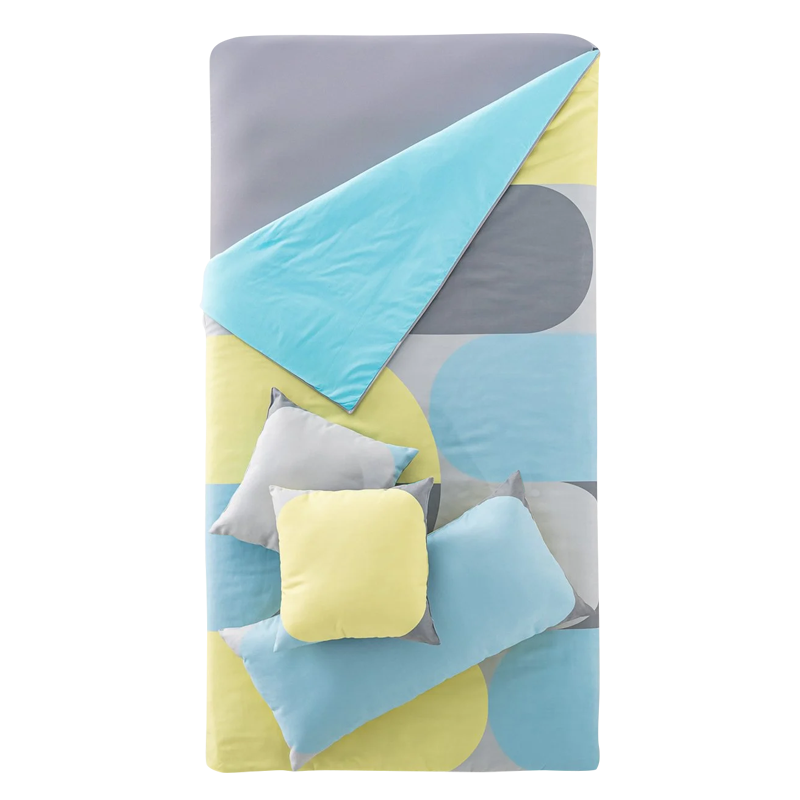 Детски спален комплект Minia е създаден да осигури комфорт и стил в детската стая. Със своя свеж и цветен дизайн, той внася уют и радост в спалното пространство на вашето дете. Комплектът включва правоъгълна възглавница с размери 80x40 см, две квадратни възглавници 40x40 см, калъфка за възглавница 70х50 см, шалте с размери 130x205 см и ластичен чаршаф с размери 152x252 см. Шалтето е изпълнено с 130 г/м² термо вата, която осигурява топлина и мекота, а използваните материали са антибактериални, антиалергични и антиканцерогенни, гарантирайки безопасност за здравето на вашето дете. Препоръчва се химическо чистене за възглавниците и шалтето, докато чаршафът може да се пере в пералня. Този комплект е идеален за легла с размери 80x180 см, предоставяйки пълен комфорт и здравословен сън. Пълна информация за размерите и характеристиките на модела ще намерите в таблицата в таб/поле "Техническа информация".