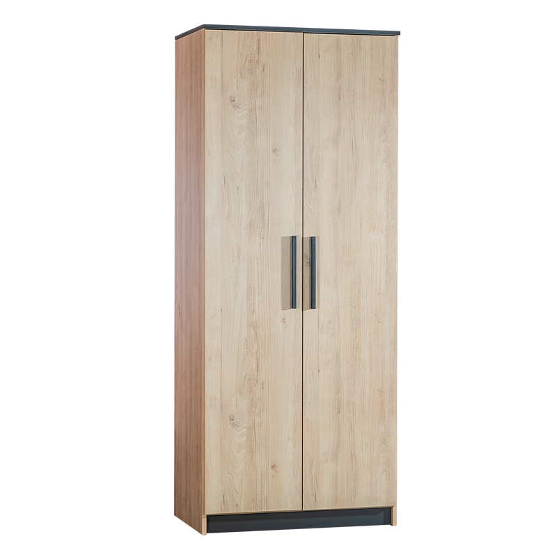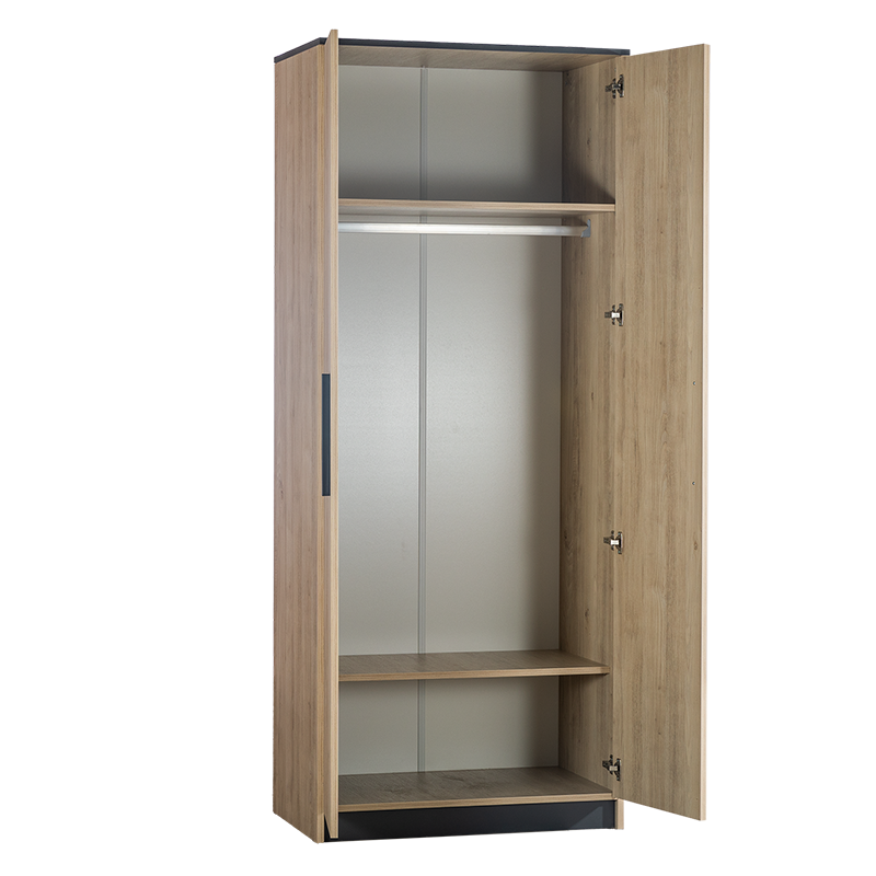 Детски двукрилен гардероб TORINO с две врати е елегантно и функционално допълнение към всяка младежка стая. Със своите размери 85 см ширина, 209 см височина и 53 см дълбочина, той предлага достатъчно пространство за съхранение на дрехи и аксесоари, като същевременно заема минимално място в помещението. Вътрешността на гардероба включва високоустойчив алуминиев лост за закачалки, предоставящ просторна зона за дрехи, а рафтовете, изработени от 18 мм ПДЧ, могат да издържат до 25 кг и са подвижни, позволявайки адаптиране според нуждите. Здравите дръжки гарантират дълготрайна и безопасна употреба. Детски двукрилен гардероб TORINO не само помага за поддържане на реда, но и придава модерен и стилен вид на интериора.