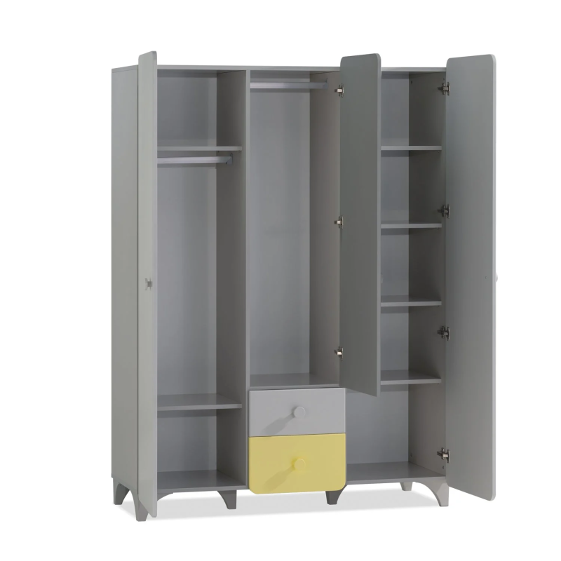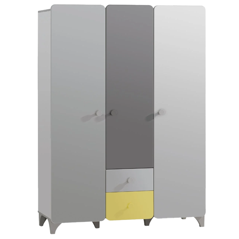 Трикрилен гардероб MINIA ви позволява да съхранявате подредени дрехи и играчки. Благодарение на трите отделения спокойно може да приберете голяма част от вещите в детската стая. Моделът разполага с два лоста за закачалки, 4 просторни рафта с товароносимост до 25 кг и 2 чекмеджета. Всички вратички разполагат с механизъм за плавно затваряне, което ги прави безопасни и безшумни. Пълна информация за размерите и характеристиките на модела ще намерите в таблицата в таб/поле "Техническа информация".