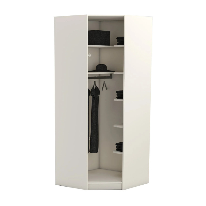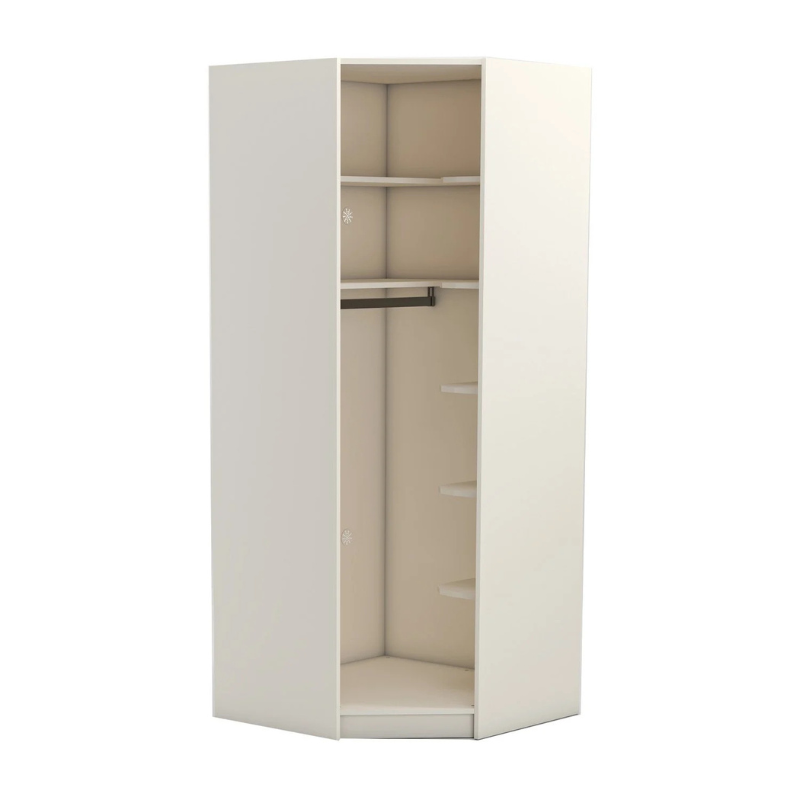 Съчетание на елегантност и практичност, ъгловият гардероб YORK впечатлява със своя модерен дизайн и прецизна изработка. Изработен от висококачествено ПДЧ с дебелина 18 мм в елегантен кремав цвят, той предлага стил и функционалност в едно. Вътрешното разпределение включва 7 рафта и 1 лост за закачалки – интелигентно организирано пространство, създадено за комфорт и удобство. За допълнителен комфорт гардеробът разполага с вентилационни отвори на гърба. Предлага се без врата, която може да бъде закупена допълнително като опция. Може да се използва самостоятелно или като модул в комбинация с другите модели от серията YORK. Пълна информация за размерите и характеристиките на модела ще намерите в таблицата в таб/поле "Техническа информация".