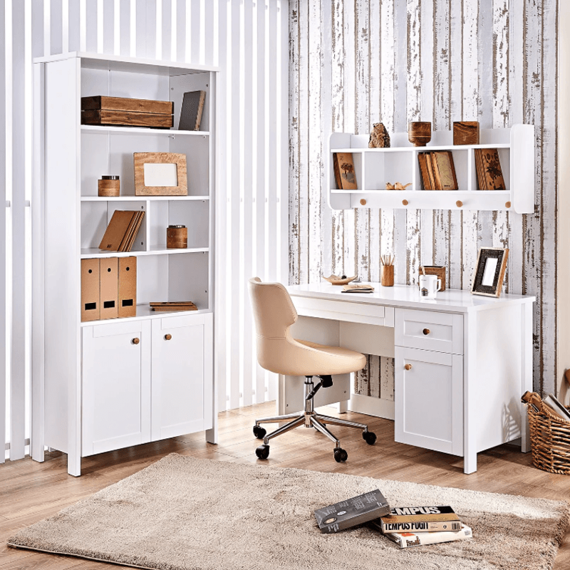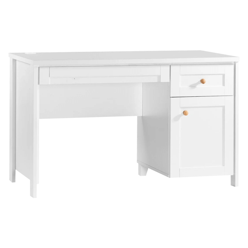 Детско бюро OSLO предлага модерна визия и удобства, съобразени със съвременния начин на работа и учене. Изработено от висококачествени материали – плоскости с дебелина 18–25 мм и MDF профили 22 мм – моделът осигурява стабилност, дълготрайност и безопасност при ежедневна употреба. Бюрото е оборудвано с вграден USB захранващ модул, който улеснява зареждането и използването на мобилни устройства директно на работния плот. Чекмеджетата и вратите са с плавно затваряне, а при по-тясното чекмедже е използван телескопичен механизъм за по-голяма стабилност и плавност на движение. Металните дръжки осигуряват здравина и комфорт, а крачетата с височина 8 см позволяват лесно почистване с робот-прахосмукачка. Пълна информация за размерите и характеристиките на модела ще намерите в таблицата в таб/поле "Техническа информация".