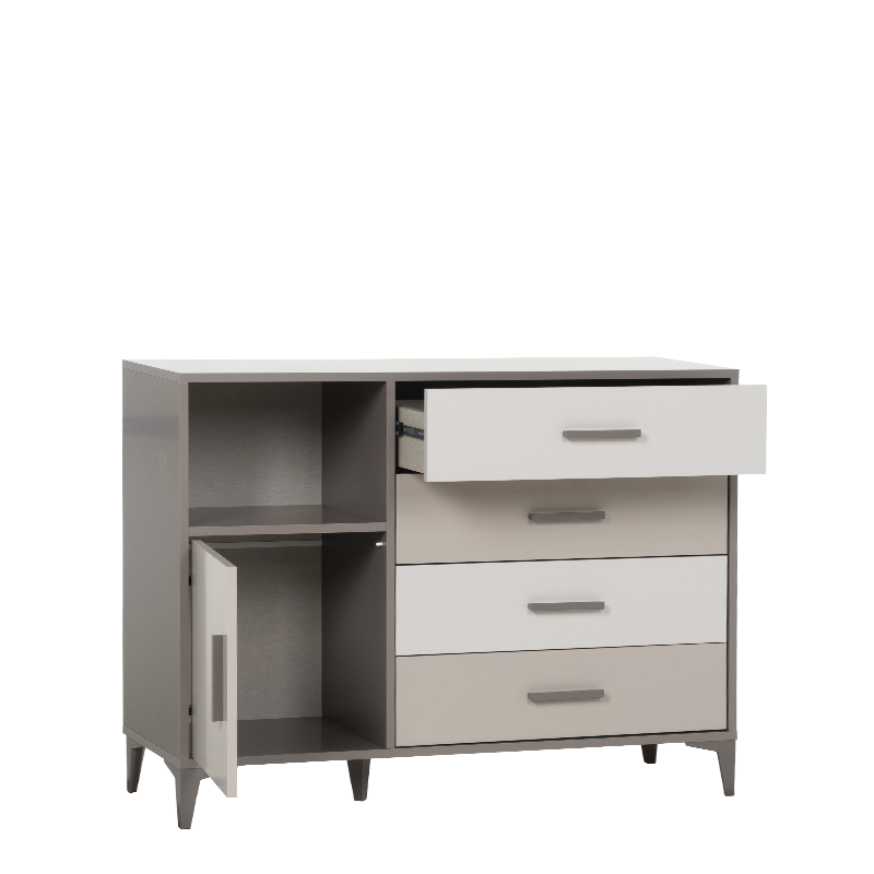 Детският скрин RIGA комбинира четири чекмеджета и еднокрилен шкаф, които осигуряват достатъчно място за съхранение на дрехи и аксесоари. Всички врати и чекмеджета са оборудвани с механизми и панти с плавно затваряне за по-тиха и сигурна употреба. Моделът е изработен от ПДЧ 18 мм, с ABS дръжки и високи ABS крака (12 см), подходящo за почистване с прахосмукачка робот. Пълна информация за размерите и характеристиките на модела ще намерите в таблицата в таб/поле 'Техническа информация'.