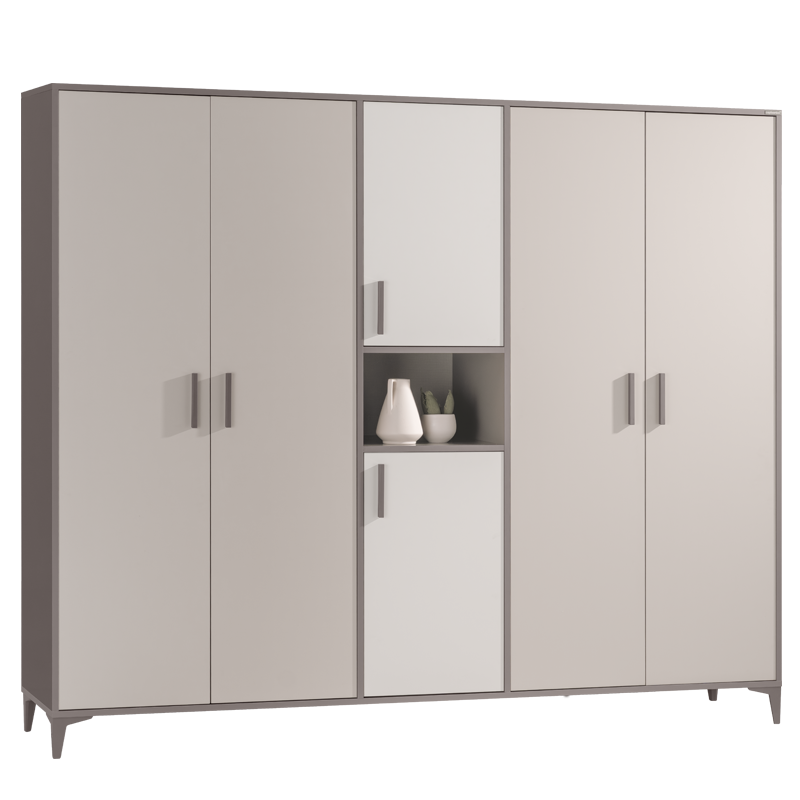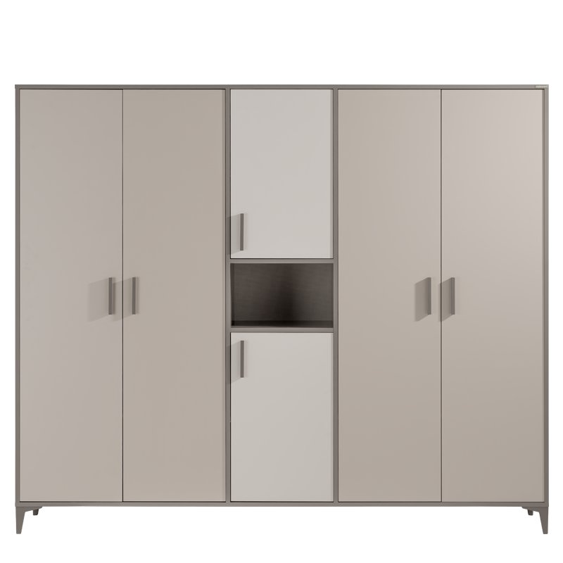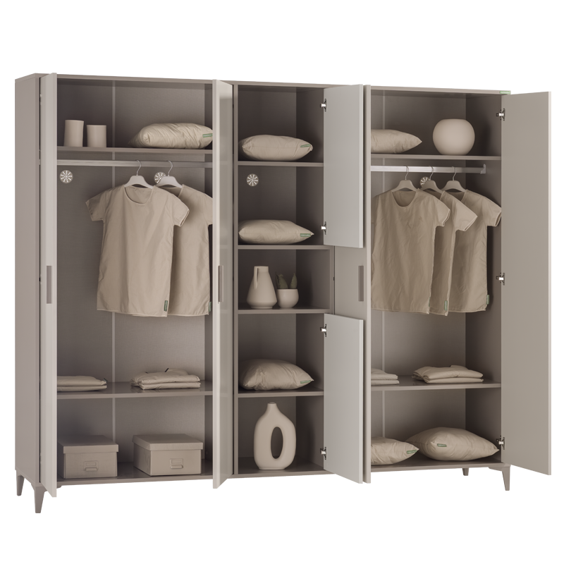 Гардеробът RIGA с 5 крила впечатлява с изчистен дизайн и функционално вътрешно разпределение, подходящо за съхранение на дрехи, обувки и аксесоари. Разполага с просторна зона за закачалки със сензорно LED осветление и отвори на гърба за естествена вентилация и циркулация на въздуха. Вратите са оборудвани с панти с плавно затваряне за допълнително удобство и безшумна употреба. Изработен е от висококачествено ламинирано ПДЧ с дебелина 18 мм. Пълна информация за размерите и характеристиките на модела ще намерите в таблицата в таб/поле 'Техническа информация'.