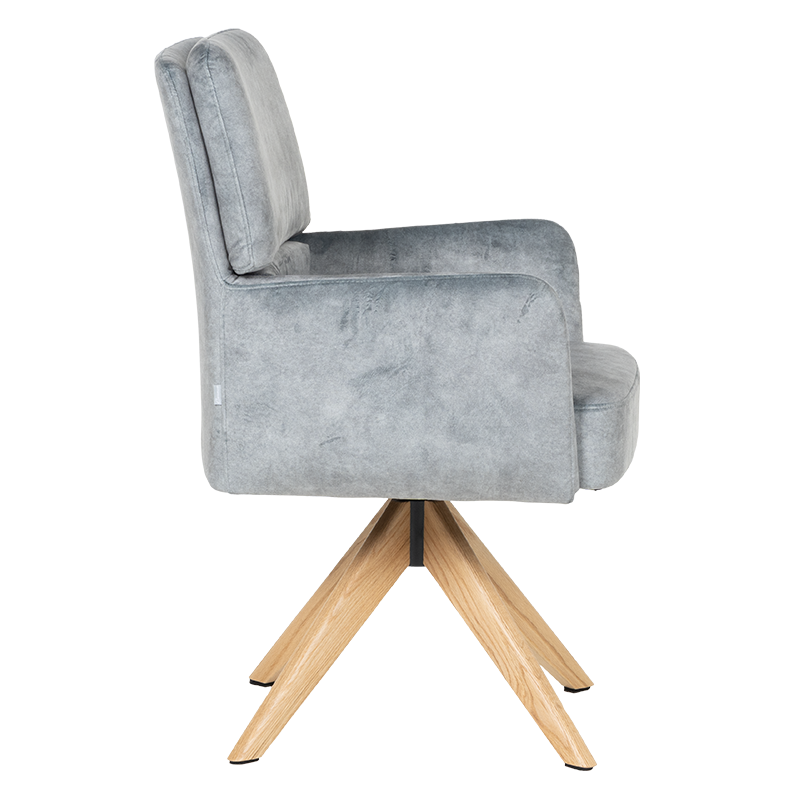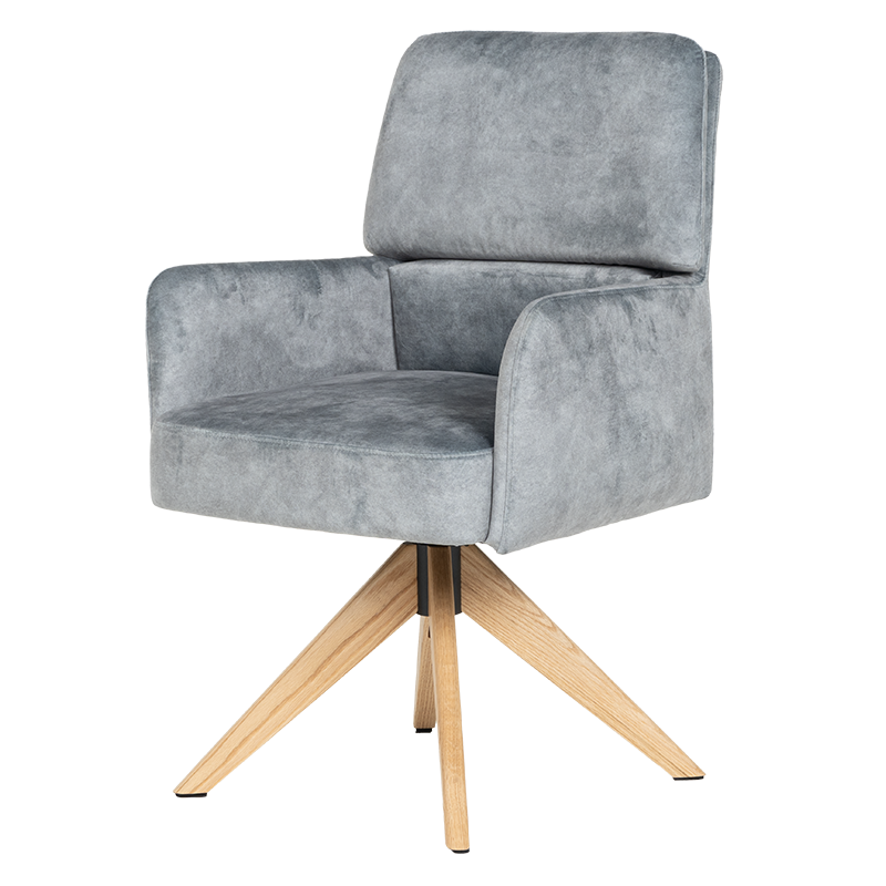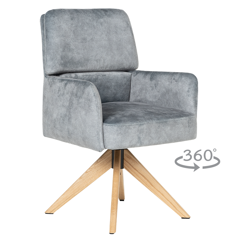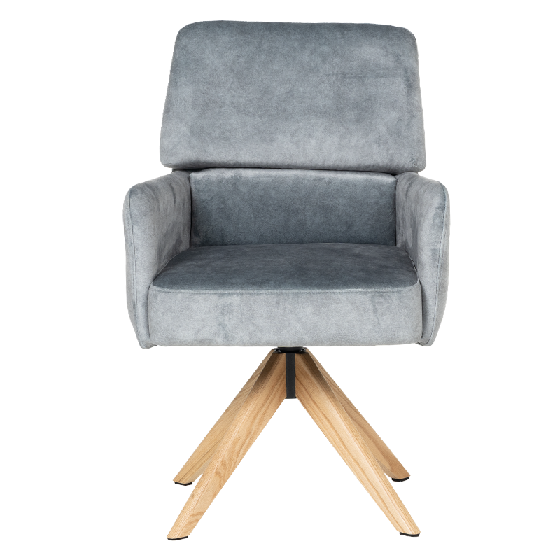 Трапезният стол Narva W впечатлява с изискан модерен облик и отлично ниво на комфорт. Седалката е тапицирана с висококачествена дамаска и разполага с вградени покет пружини, които осигуряват мекота и стабилна опора при седене. Подлакътниците допринасят за уют и удобство, докато функцията за 360° завъртане с автоматично връщане добавя практичност при използване в ежедневна обстановка. Фините дървени крака от висококачествен Червен дъб придават лек и елегантен акцент, а люлеещият механизъм е стилна и неочаквана екстра, която подсилва усещането за релакс. Максималната товароносимост от 120 кг гарантира здравина и надеждност, което прави Narva 5 отличен избор за модерна трапезария, където комфортът е на първо място.Пълна информация за размерите и характеристиките на модела ще намерите в таблицата в таб/поле "Техническа информация".