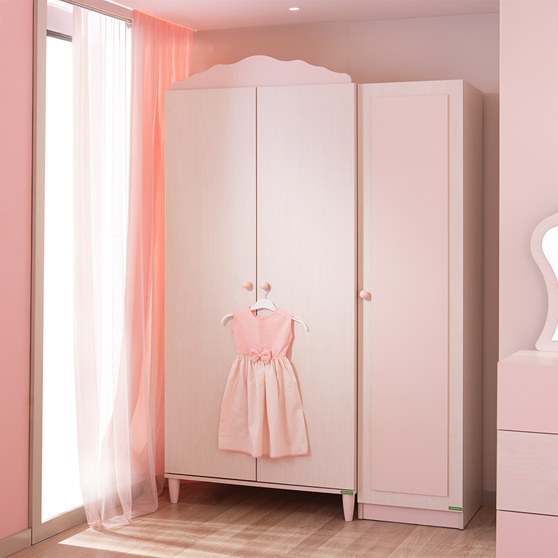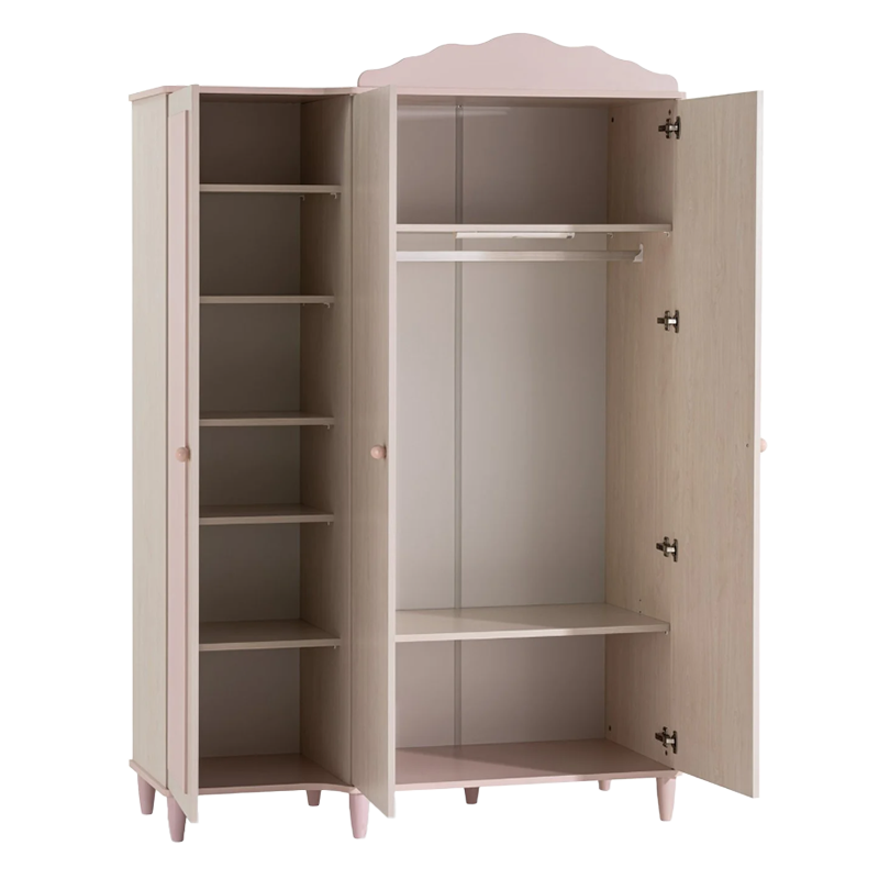 Гардеробът POLLINA с 3 врати комбинира мек розов акцент и светла дървесна текстура, създавайки нежна и хармонична атмосфера в детската стая. Модулната му конструкция позволява монтаж както отляво, така и отдясно, което го прави изключително адаптивен към различни разпределения в интериора.Моделът предлага широко място за закачалки със сензорно LED осветление, регулируеми рафтове с товароносимост до 25 кг и плавно затварящи се врати. Пълна информация за размерите и характеристиките на модела ще намерите в таблицата в таб/поле 'Техническа информация'.
