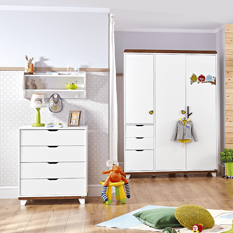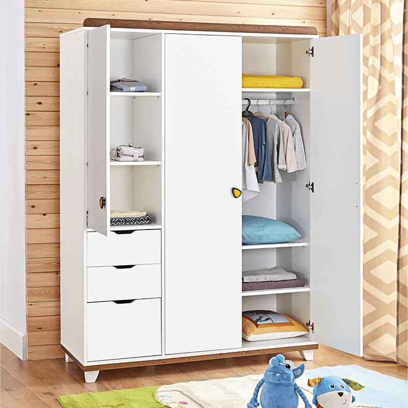 Детският гардероб Kakule впечатлява с изчистен и модерен дизайн, подходящ за всяка детска стая. Разполага с три врати с механизъм за плавно затваряне, практично LED осветление във вътрешността и функционално разпределение – рафтове, лост за закачалки и три удобни чекмеджета. Изработен е от висококачествени материали, които гарантират здравина и дълготрайна употреба. Пълна информация за размерите и характеристиките на модела ще намерите в таблицата в таб/поле "Техническа информация".